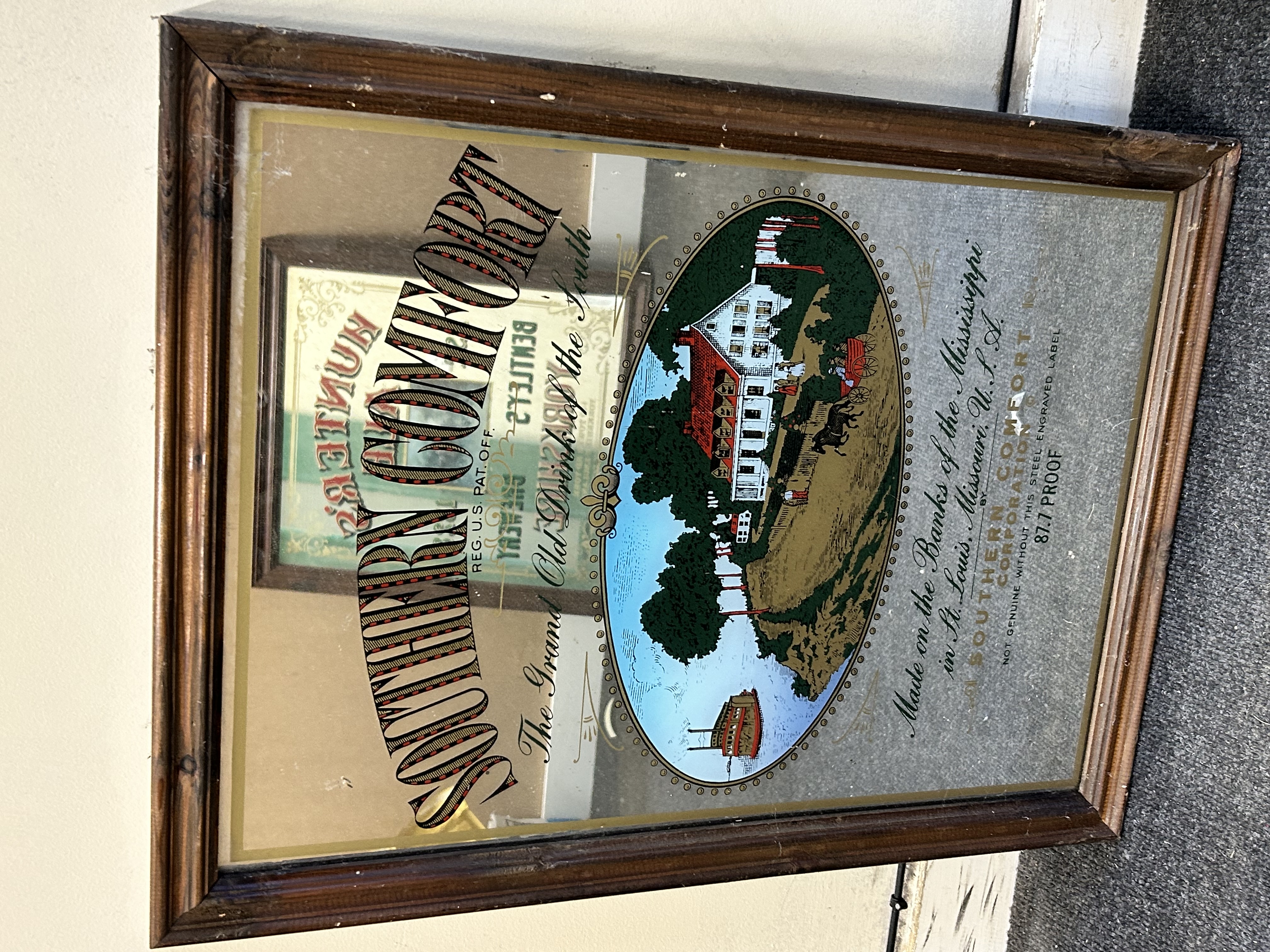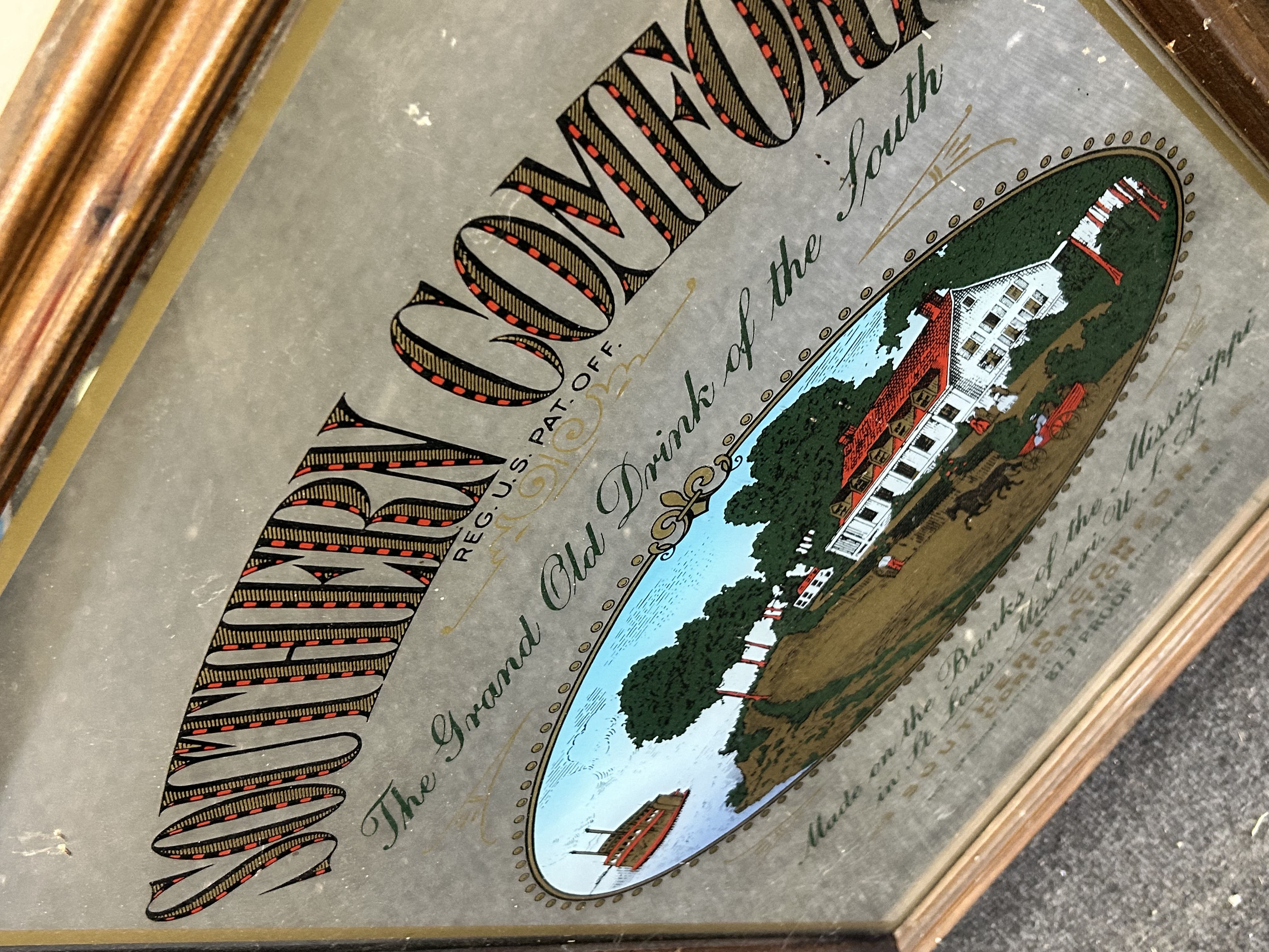 A late 20th-century advertising pub mirror for Southern Comfort liqueur. The rectangular mirror features a central oval vignette depicting a white plantation-style house on a riverbank with a steamboat in the foreground and a horse-drawn carriage. The brand name Southern Comfort is displayed in a stylized, arched font with decorative red and black horizontal striping and gold-tone outlining. The piece is housed in a dark-stained, moulded wooden frame. Printed inscriptions include The Grand Old Drink of the South and Made on the Banks of the Mississippi in St. Louis, Missouri, U.S.A. by Southern Comfort Corporation. Additional text includes Reg. U.S. Pat. Off., Not Genuine Without This Steel Engraved Label, and 87.7 Proof.