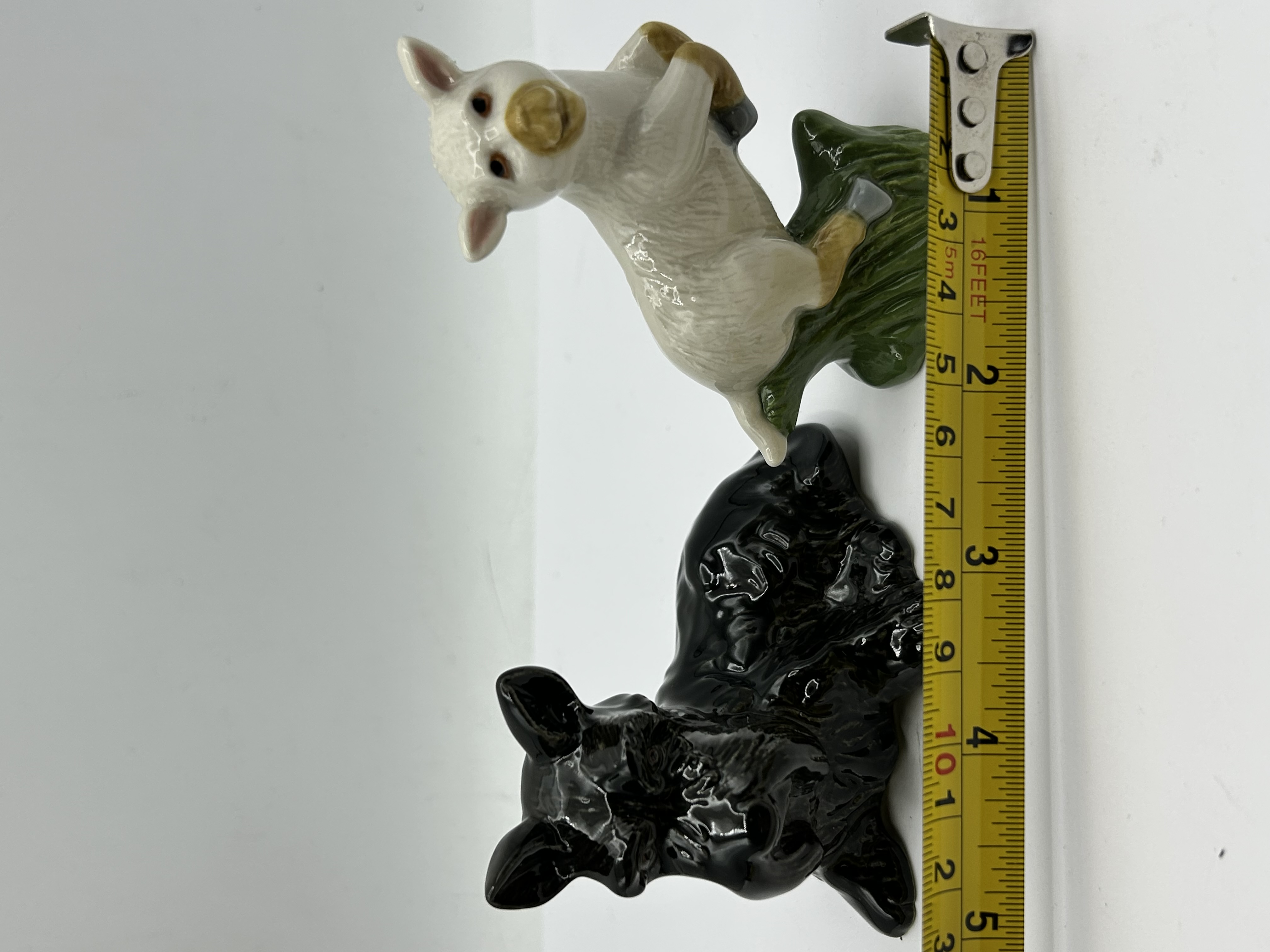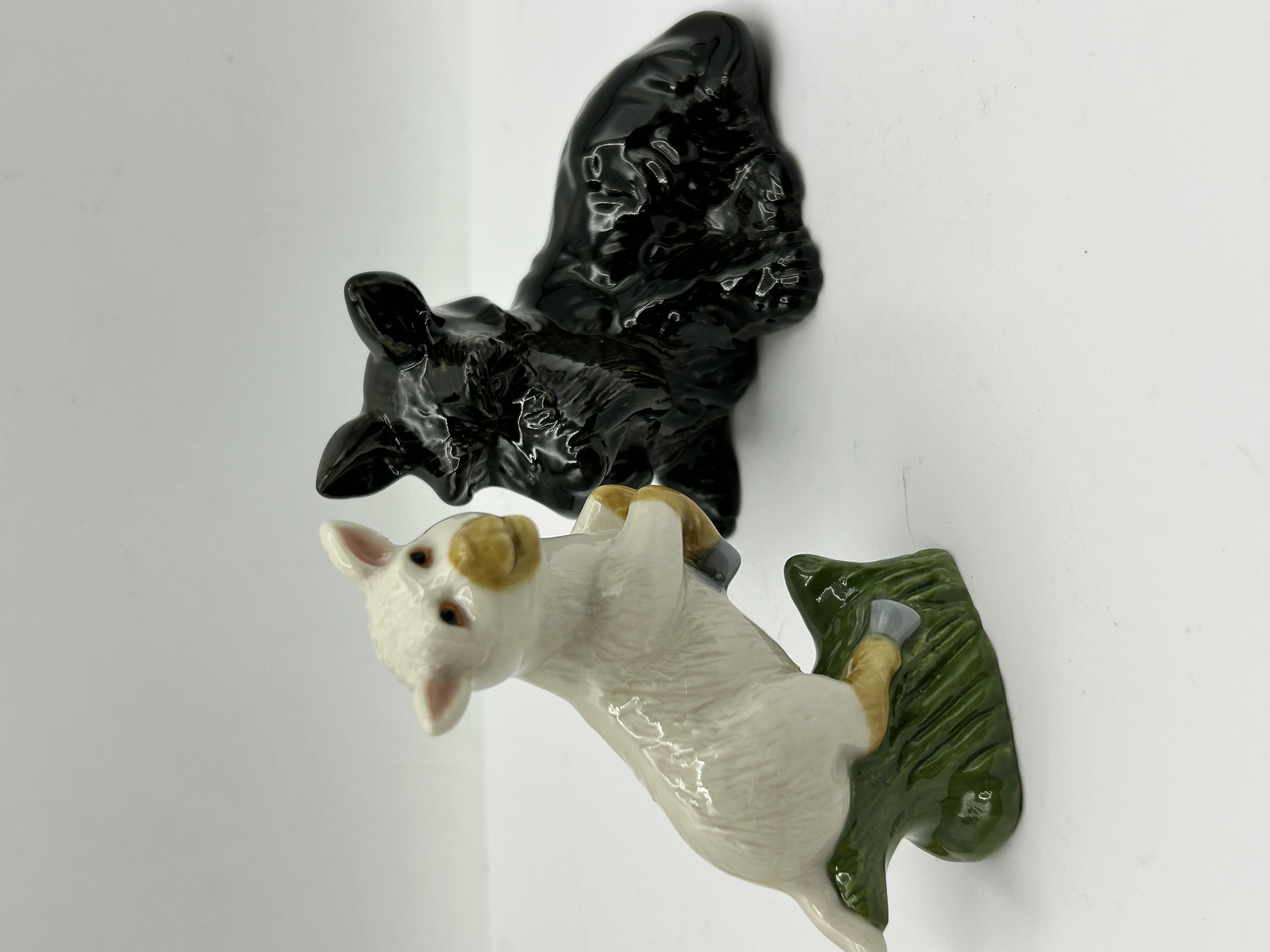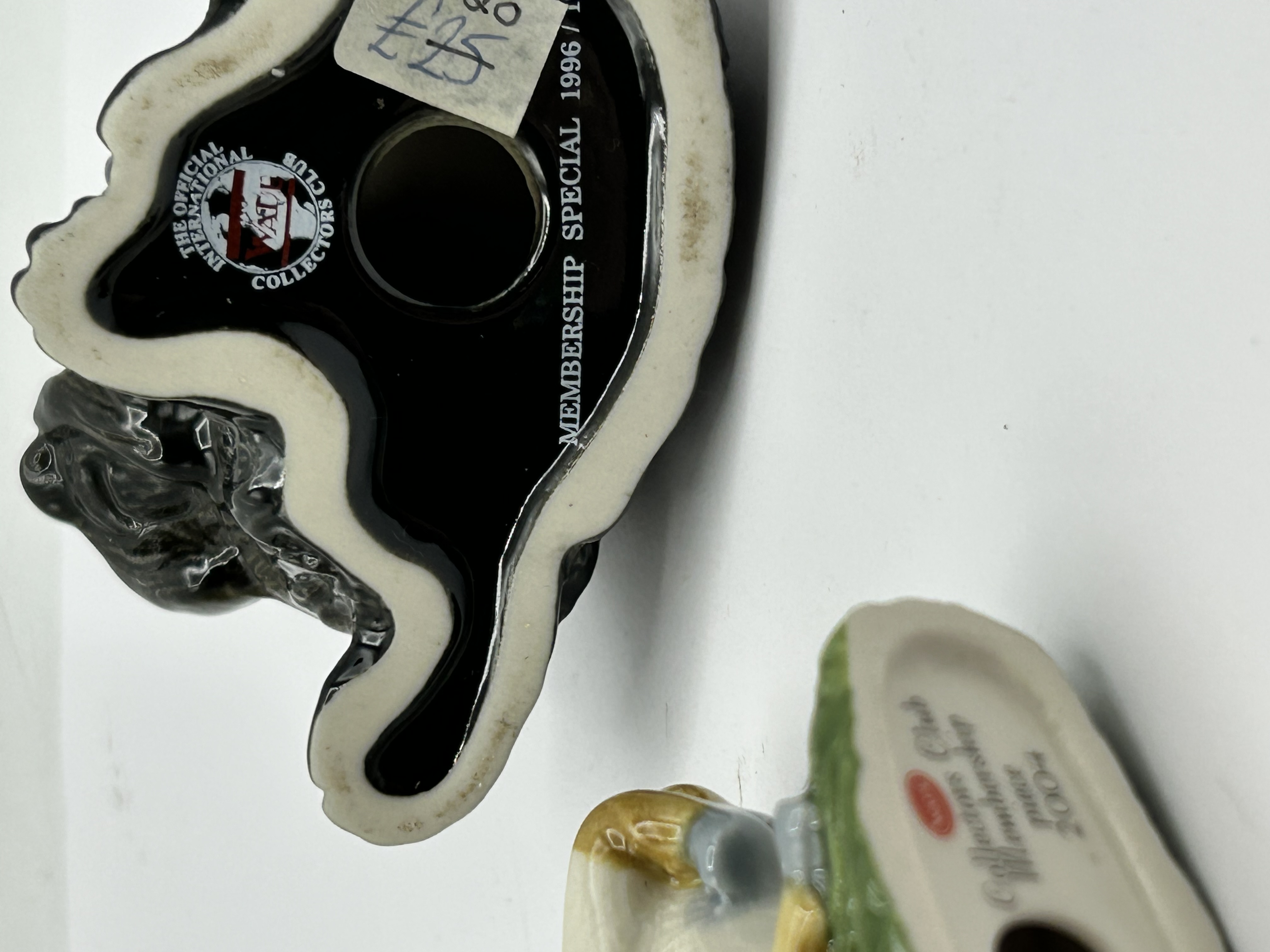 Two Wade glazed ceramic figurines produced for the Official International Collectors Club. The group consists of a recumbent dog in a black glaze and a standing lamb on a green base. The dog features a printed mark to the base for The Official International Collectors Club and is designated as Membership Special 1996/1. The lamb features a red Wade logo to the underside and is marked as a Collectors Club Membership piece 2004.