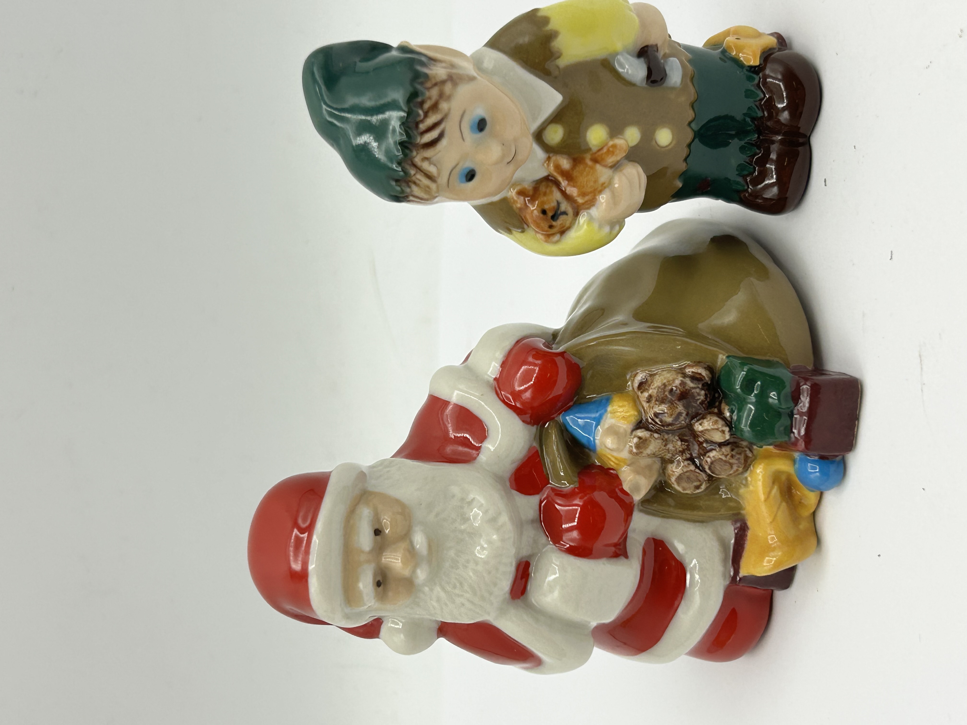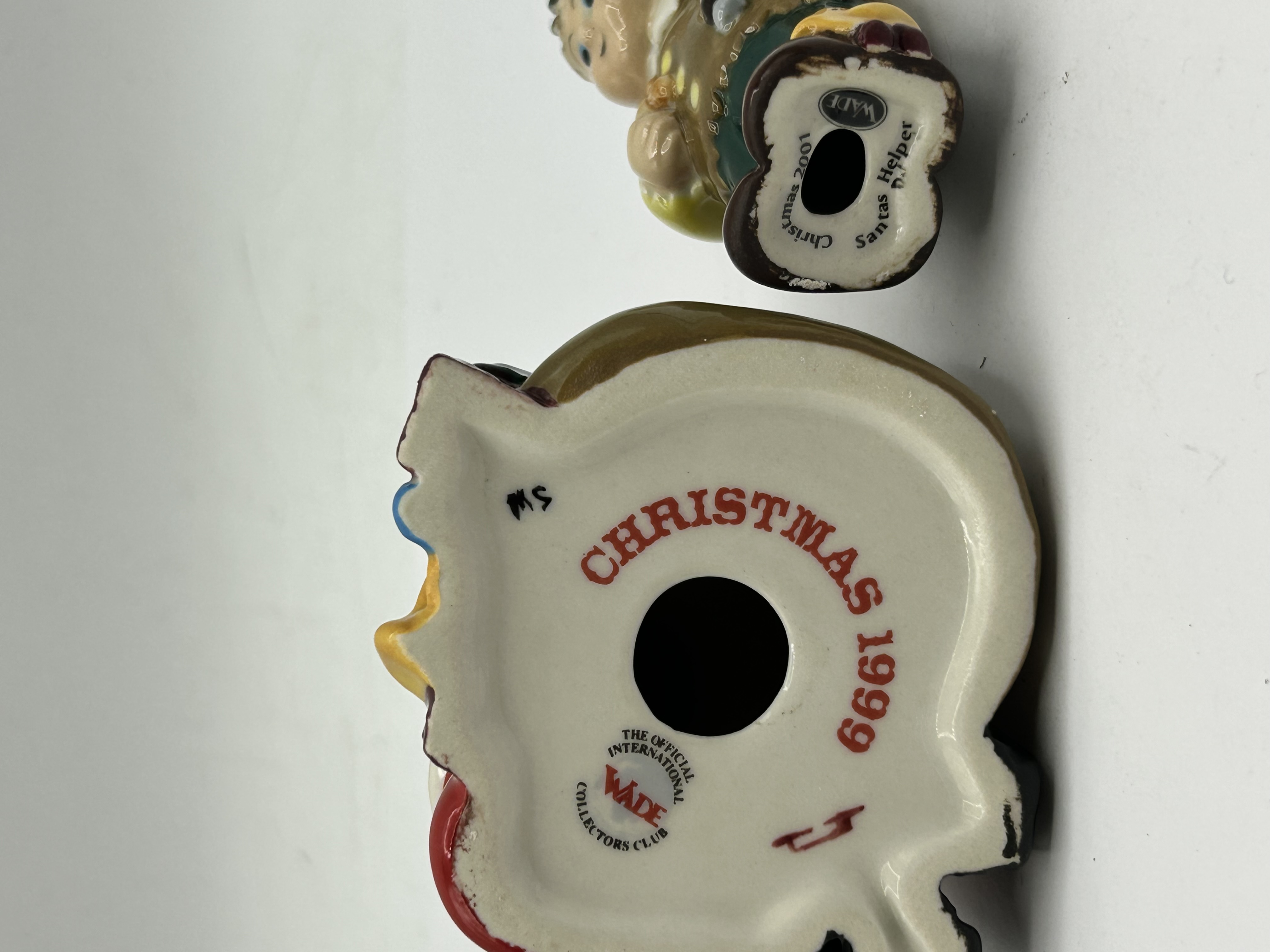 A pair of glazed ceramic figurines produced by Wade for the Official International Wade Collectors Club. The first figure depicts Santa Claus with a sack of toys, finished in a multi-coloured glaze. The base is printed in red with the text Christmas 1999 and features the official club logo alongside hand-painted initials MS and CJ. The second figure, titled Santas Helper, depicts an elf holding a teddy bear. The base of this figure is marked with the Wade logo, the year 2001, and the title Santas Helper. Both items are constructed from ceramic with a high-gloss glazed finish.