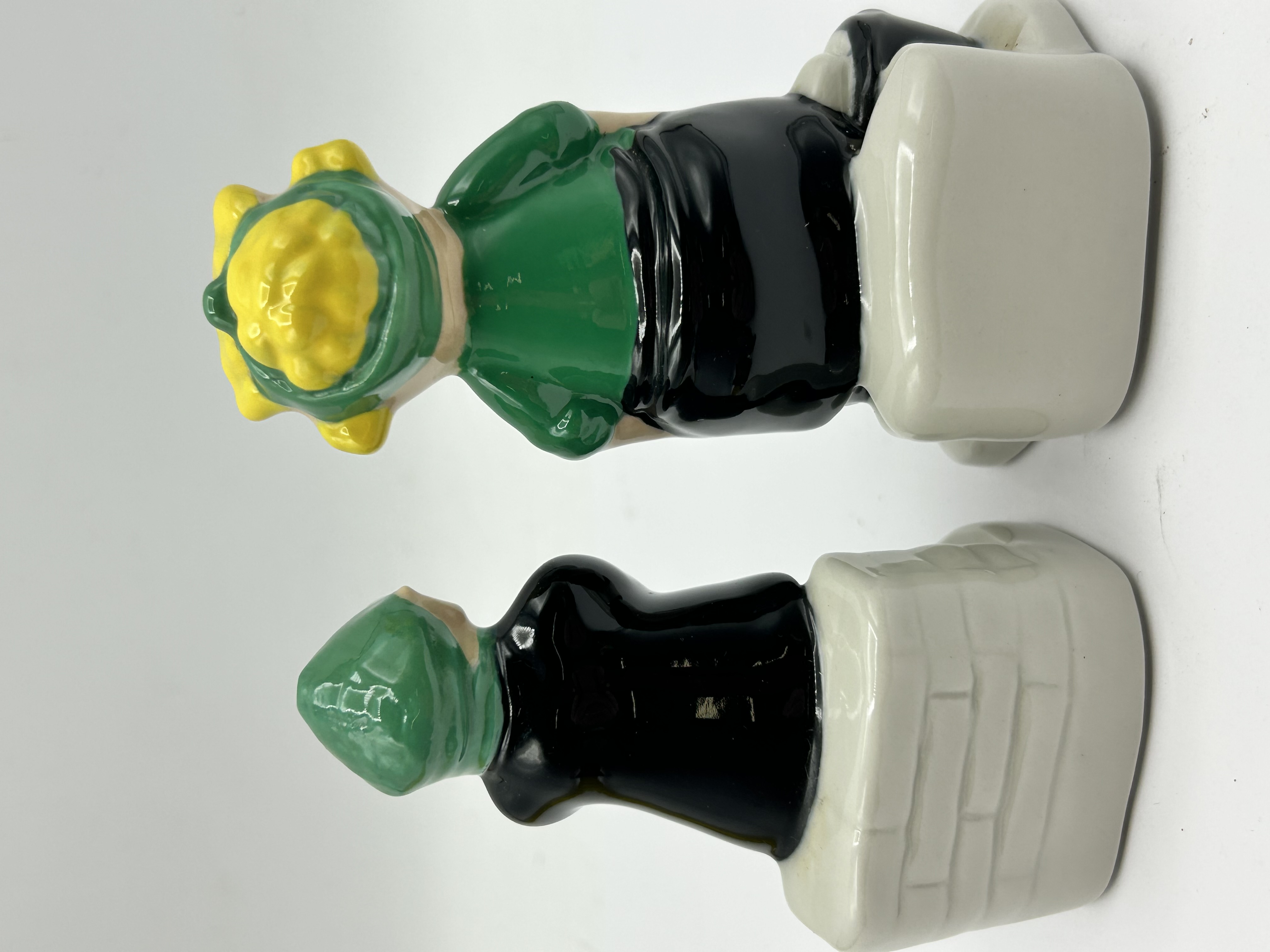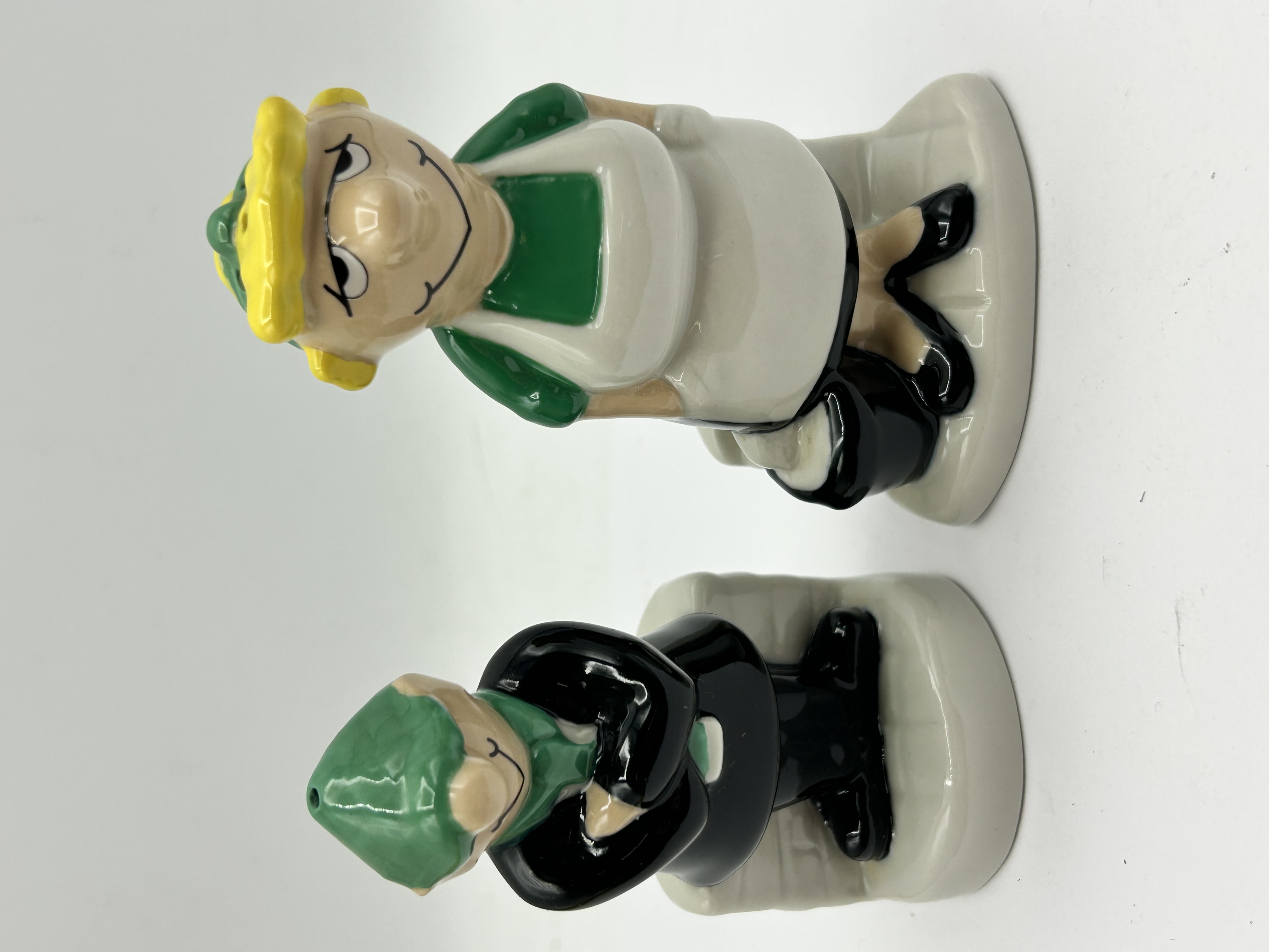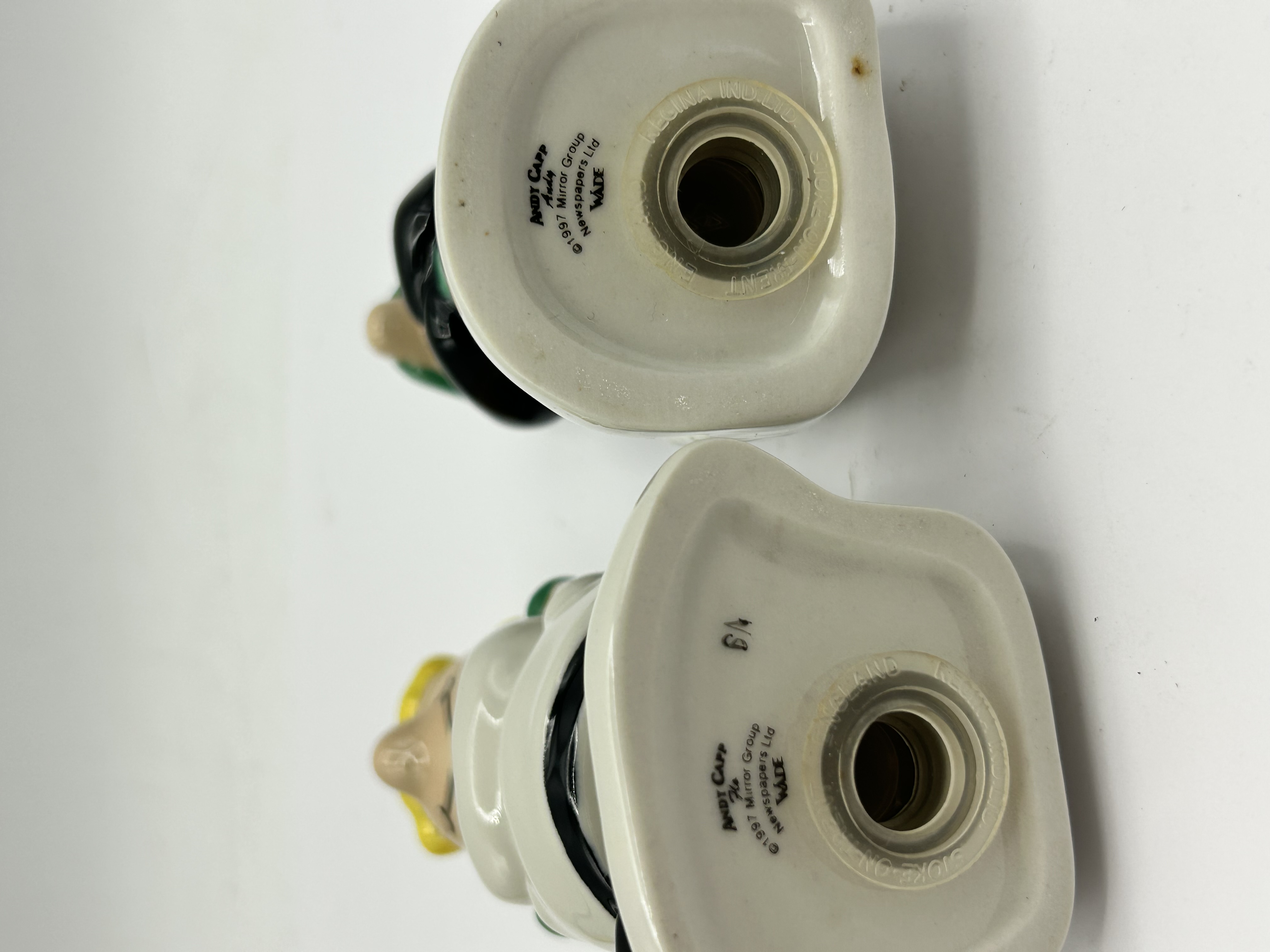 A pair of stylised ceramic salt and pepper shakers manufactured by Wade, depicting the comic strip characters Andy Capp and Flo. The figurines are finished in glossy glazes of green, black, white, and yellow. Flo is portrayed wearing a white apron with a yellow and green kerchief, while Andy is depicted in a cap with hands in his pockets. Each shaker is marked to the underside with ANDY CAPP, the respective character name, © 1997 Mirror Group Newspapers Ltd, and the WADE manufacturer mark. Both items retain their original plastic stoppers, embossed with manufacturer information from Stoke-on-Trent, England.