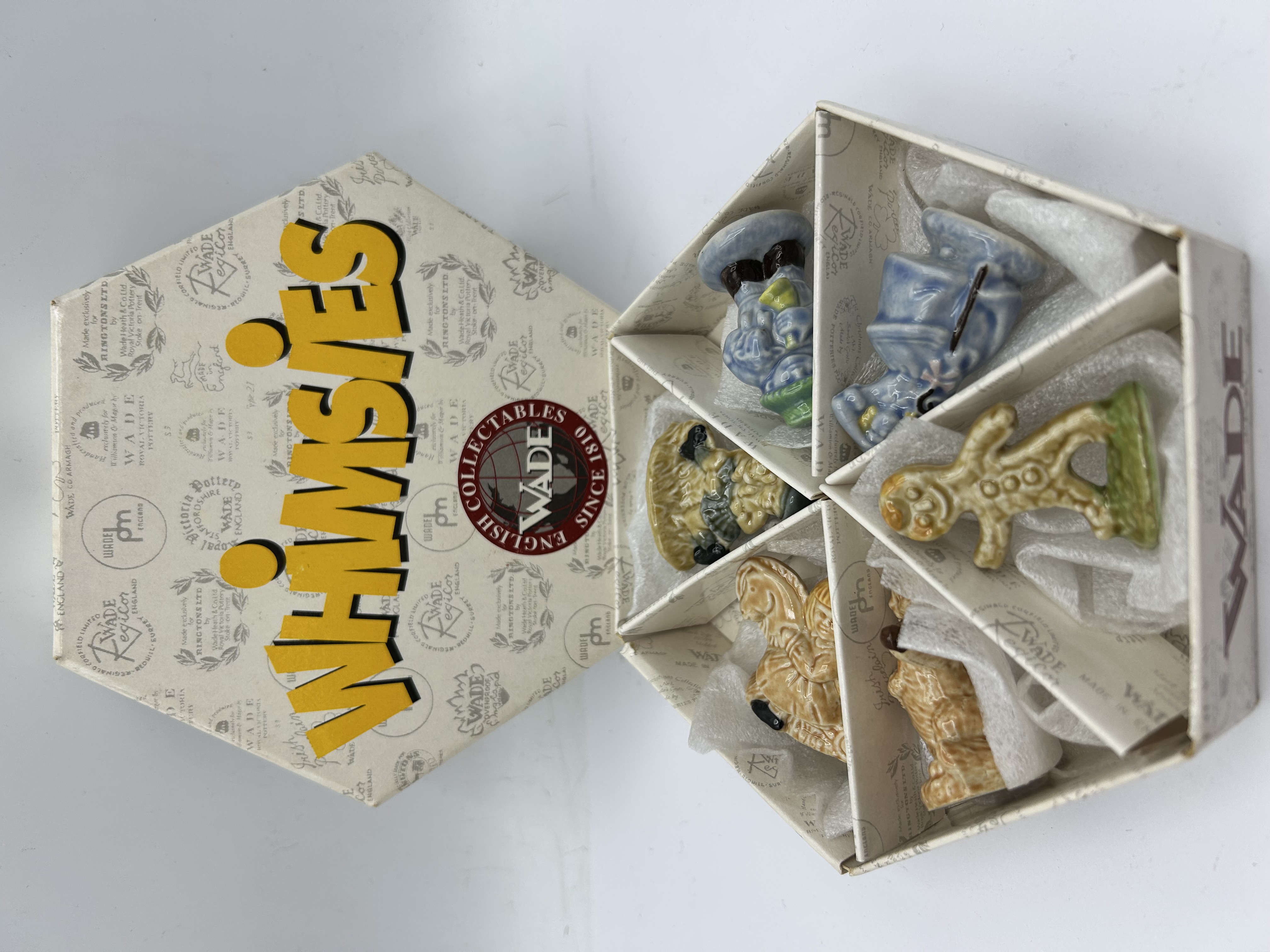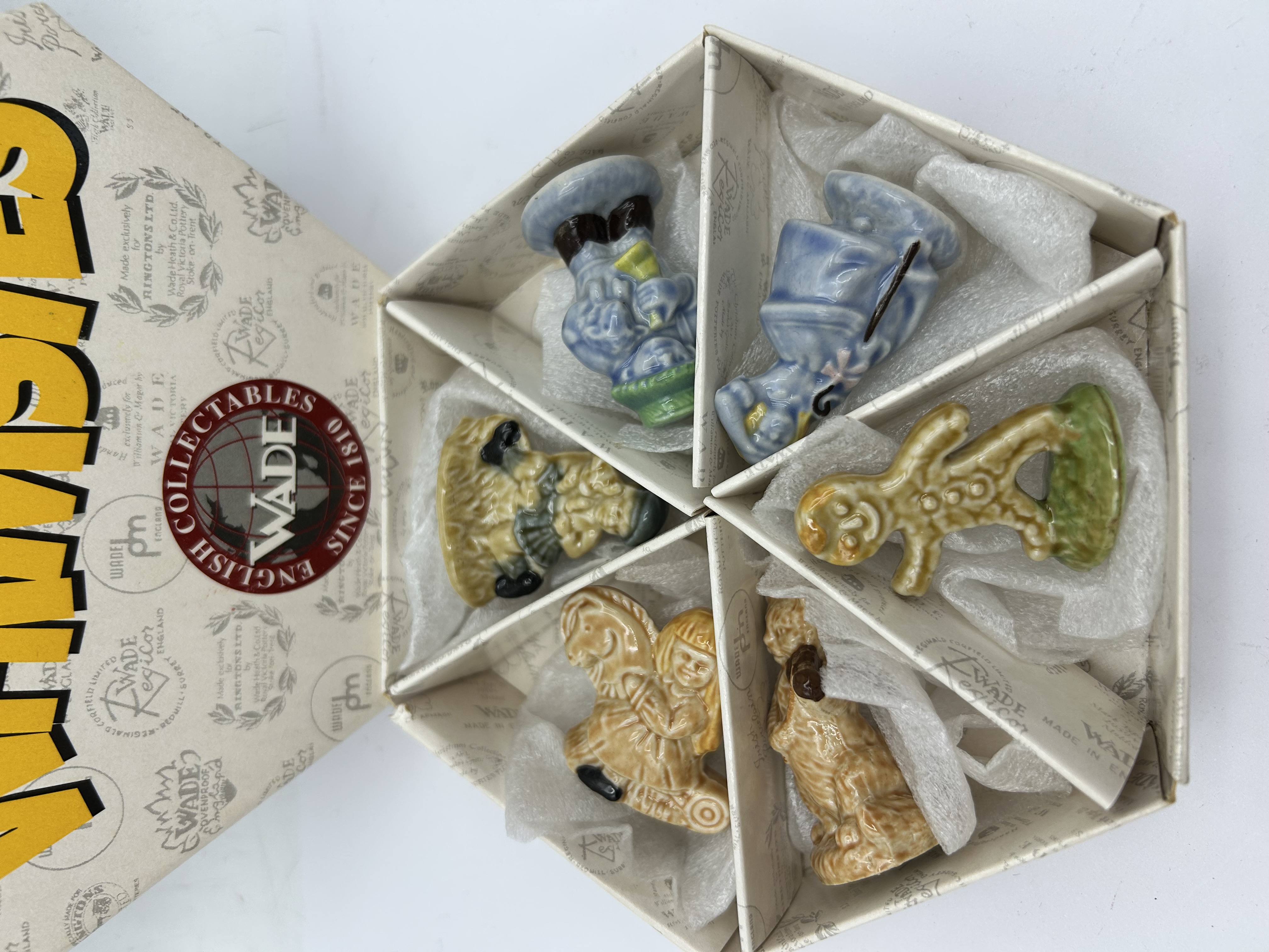 A set of Wade Whimsies glazed ceramic figurines from the Nursery Rhyme series. This collection was manufactured by Wade Heath and Co. Ltd. at the Royal Victoria Pottery in Stoke-on-Trent, England, exclusively for Ringtons Ltd. The set includes various characters including a gingerbread man and a child on a rocking horse, each featuring a polychrome glaze finish. The figurines are presented in their original hexagonal cardboard box, which features the Wade English Collectables logo and internal triangular dividers with protective tissue padding. The exterior of the box is decorated with various historical Wade backstamps and marks.