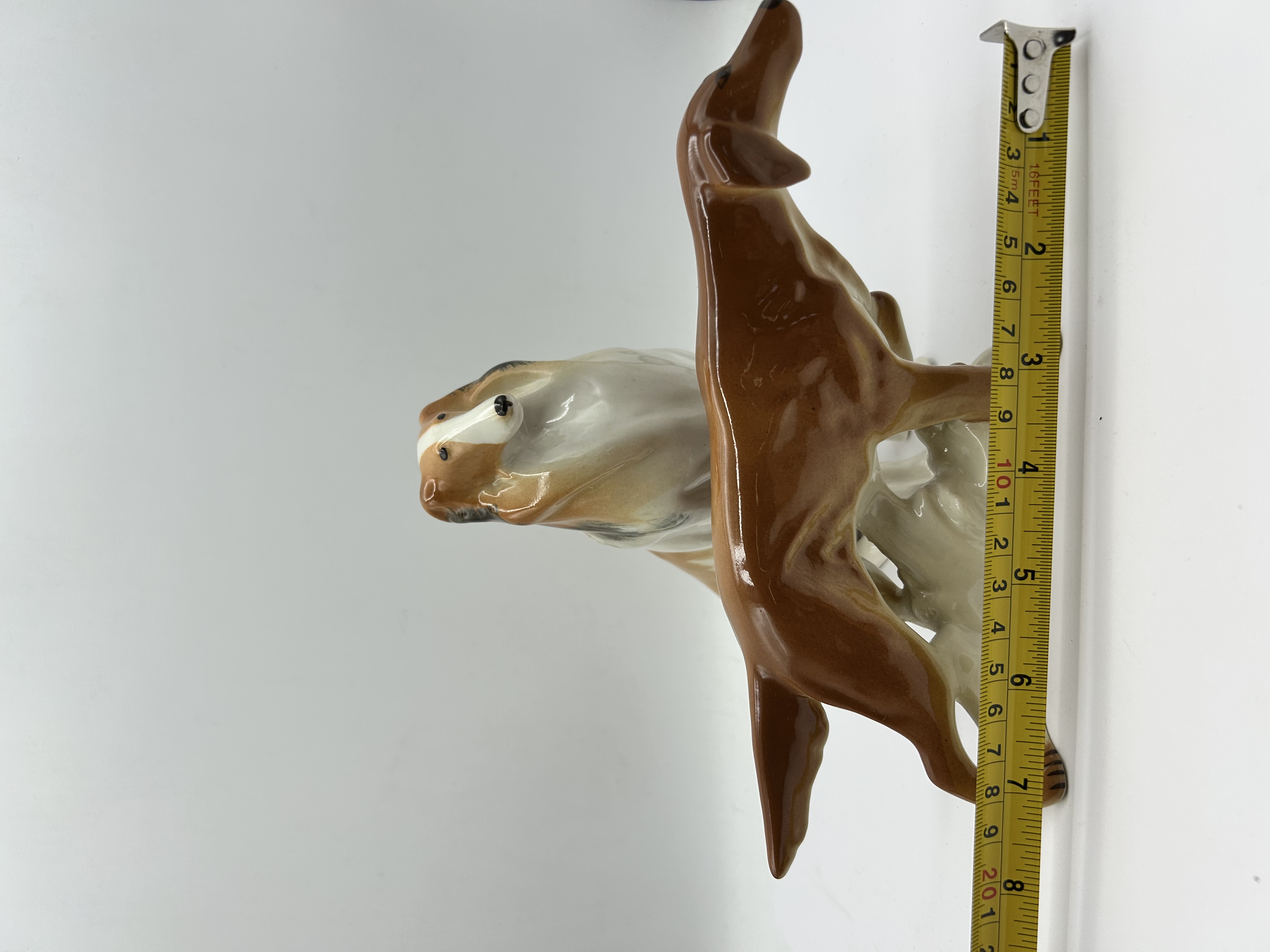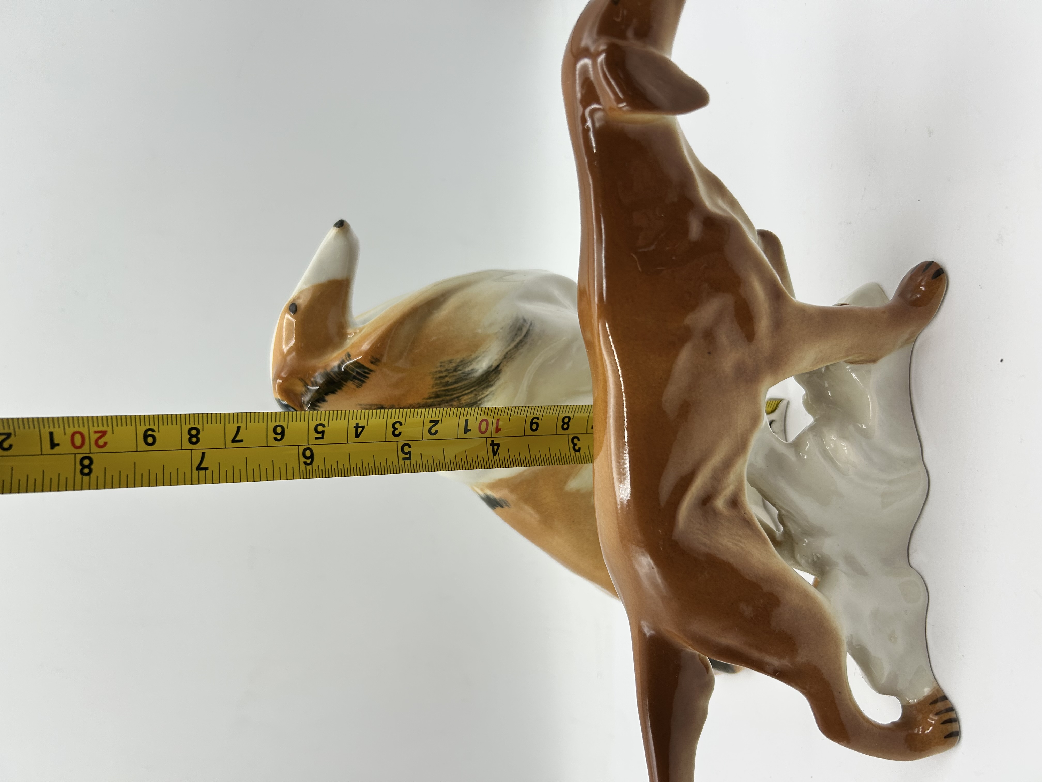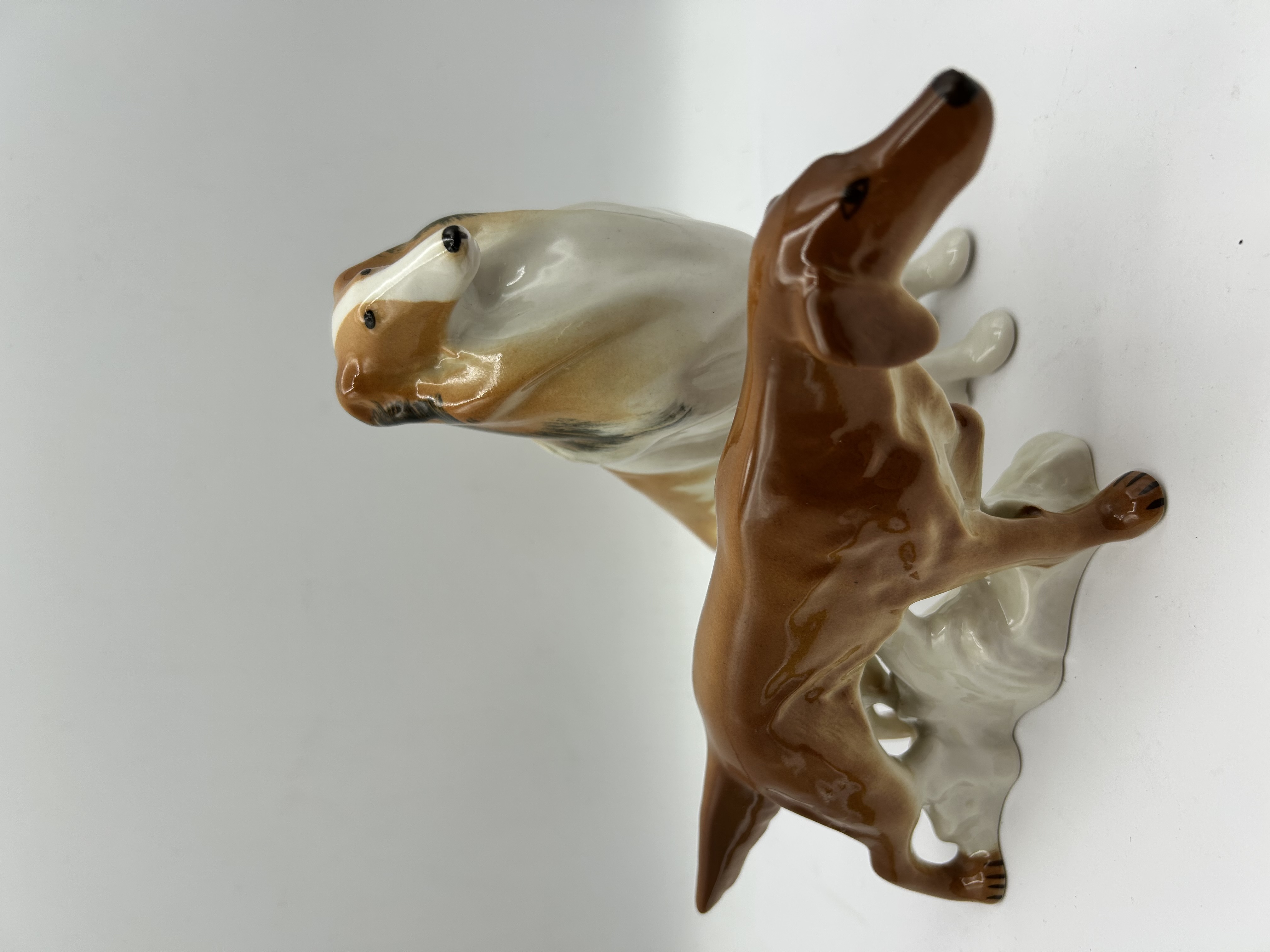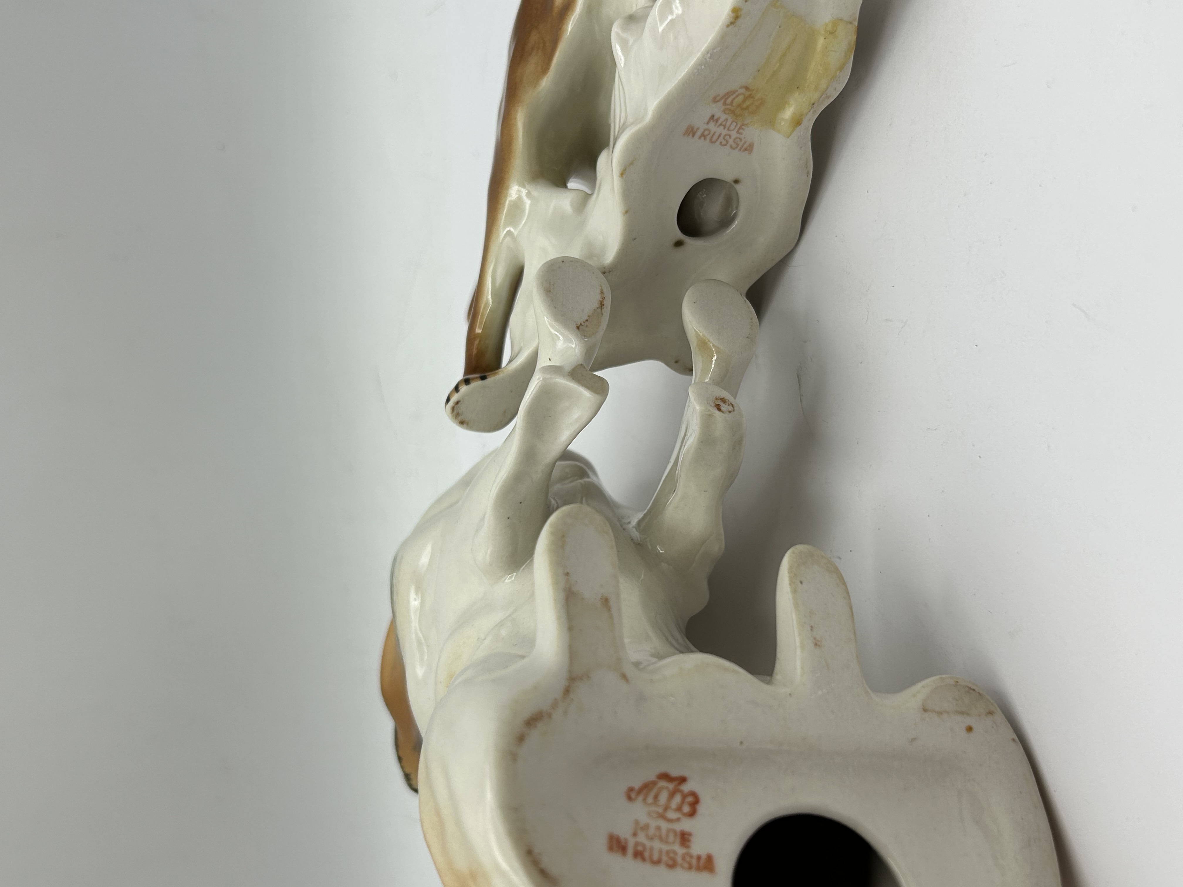 A pair of polychrome glazed porcelain dog figurines produced by the Lomonosov Porcelain Factory (LFZ). The lot features a collie in a seated position and a sleek short-haired hunting dog in a standing pose, both finished with naturalistic hand-painted details. Both pieces bear red stamped markings on the underside, including the Cyrillic ЛФЗ monogram for the Lomonosov Porcelain Factory and the English text MADE IN RUSSIA.