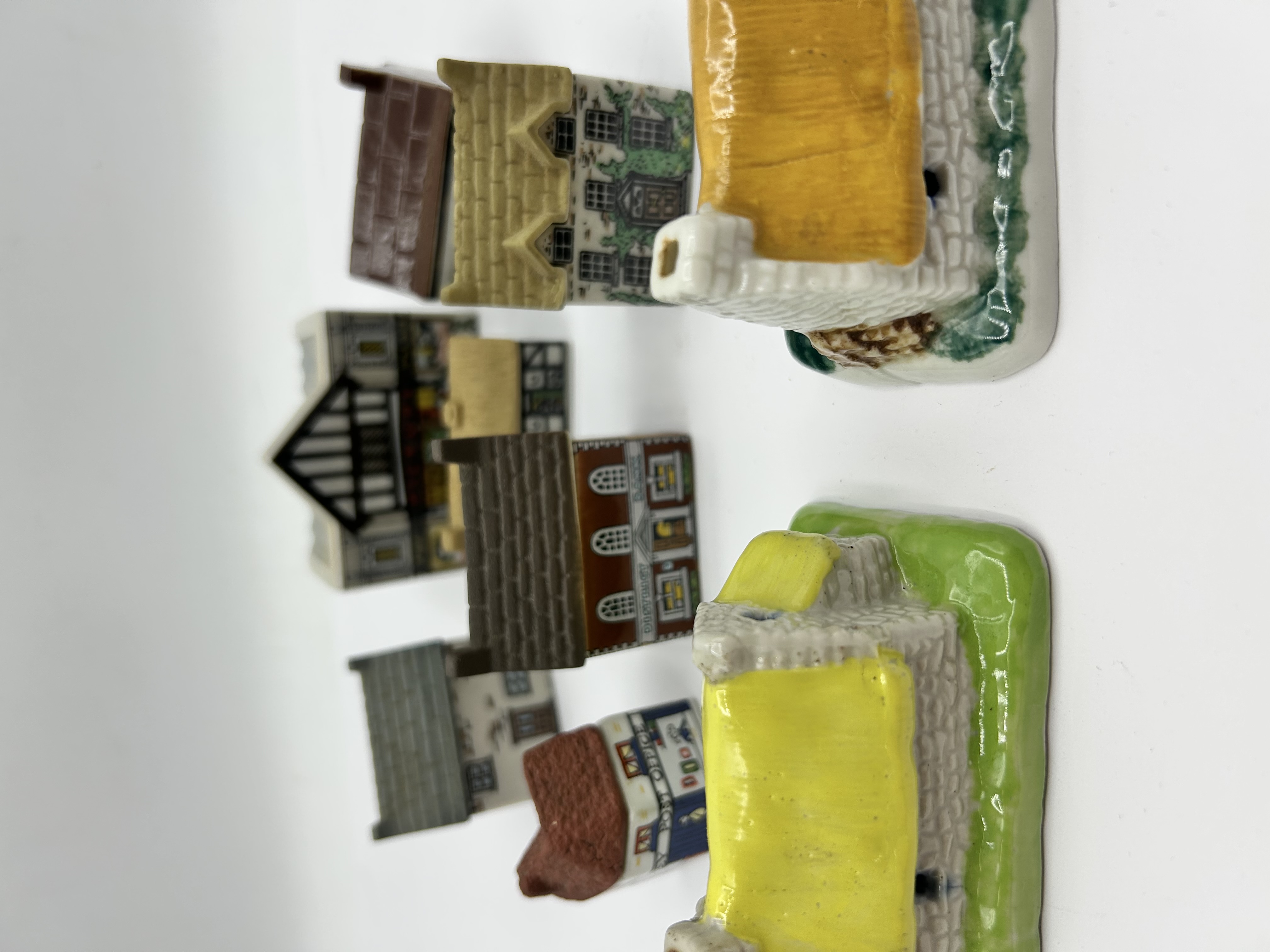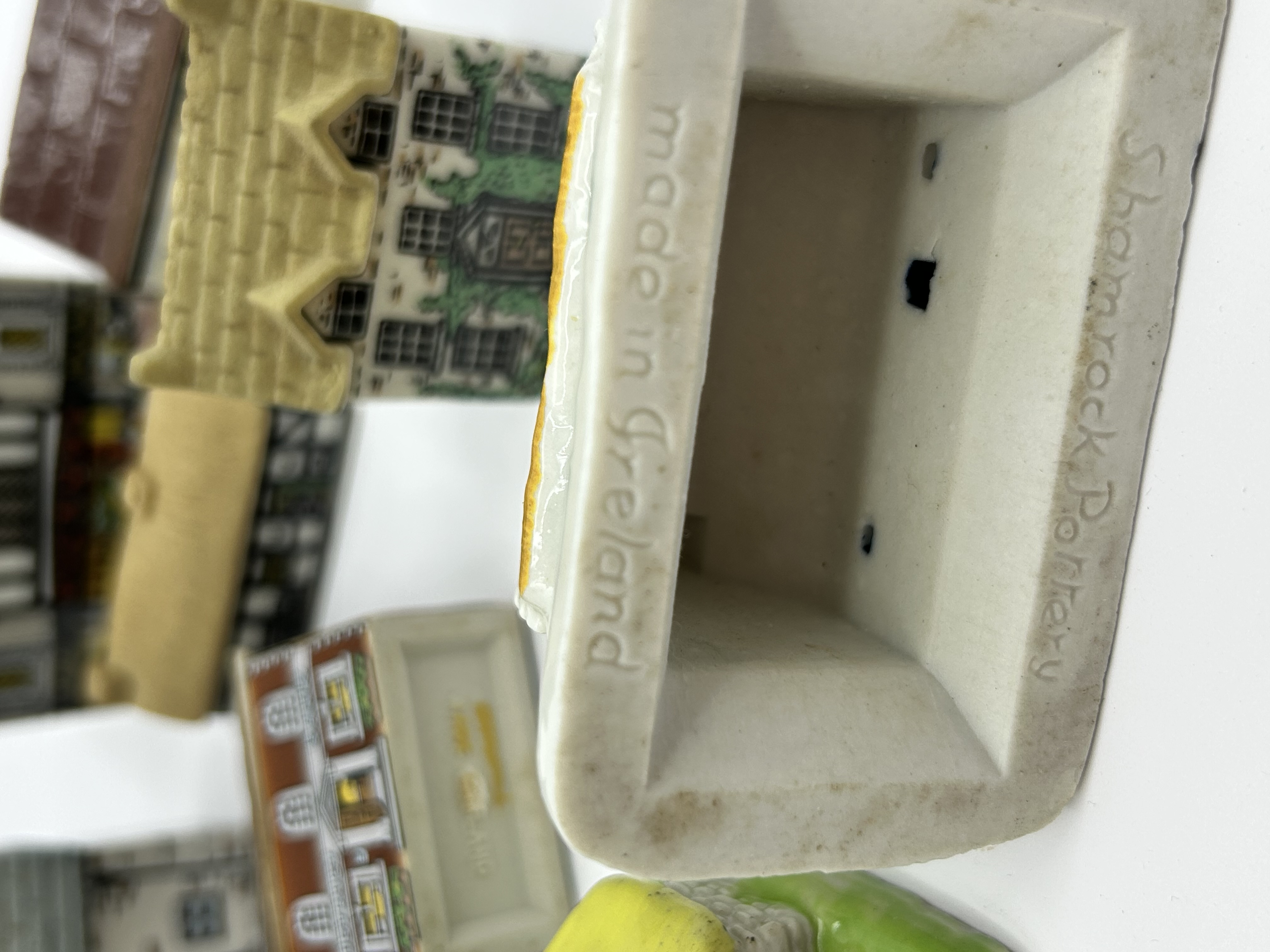 A collection of miniature ceramic village buildings. The assortment features various architectural designs including half-timbered facades, thatched-roof cottages, and brick-effect structures. Notable buildings within the group are titled The Picture Palace, District Bank, and Post Office. The pieces are constructed from ceramic with polychrome painted and glazed finishes. Visible markings on the recessed bases include the embossed inscriptions Wade England and Shamrock Pottery Made in Ireland.