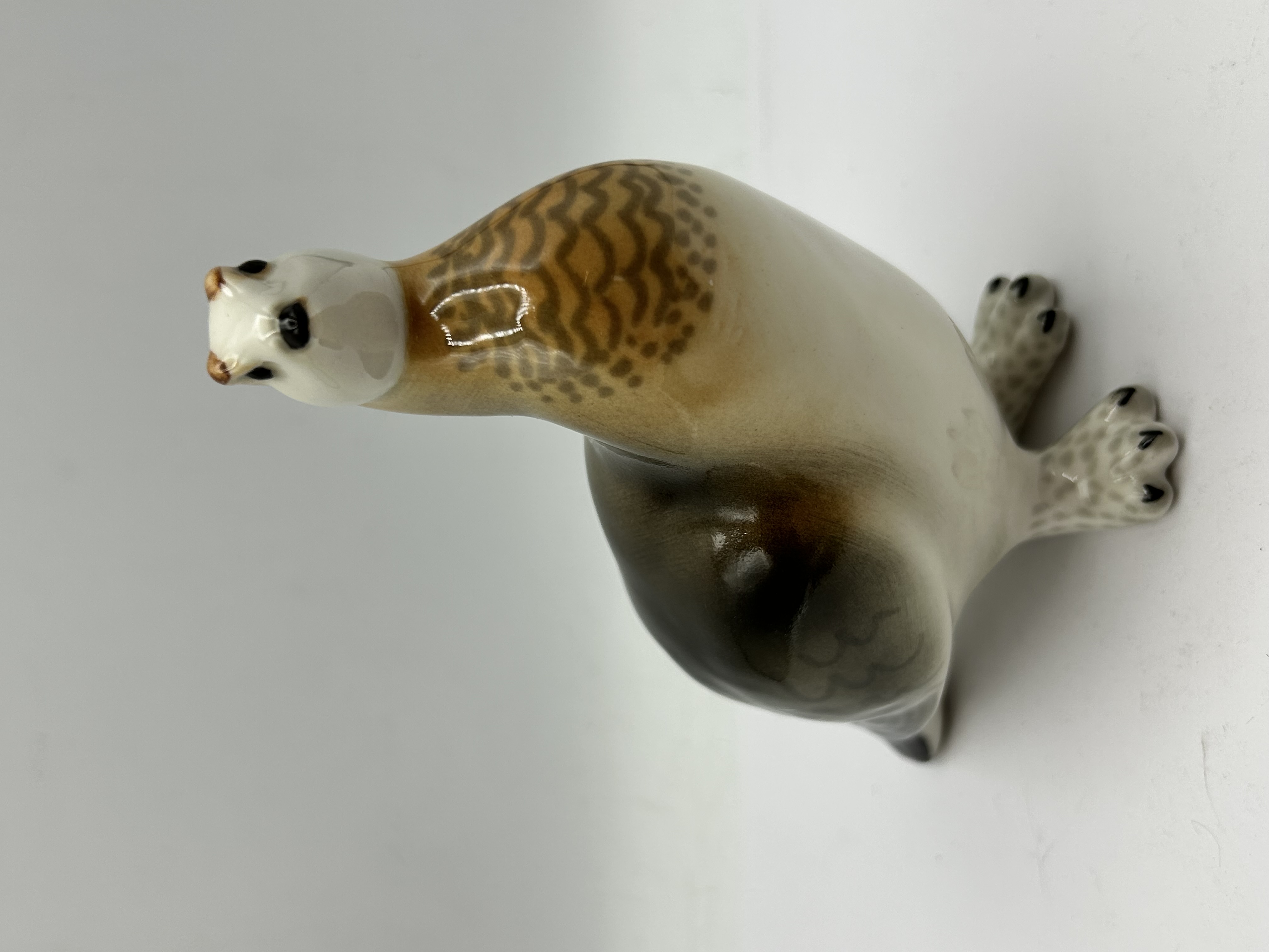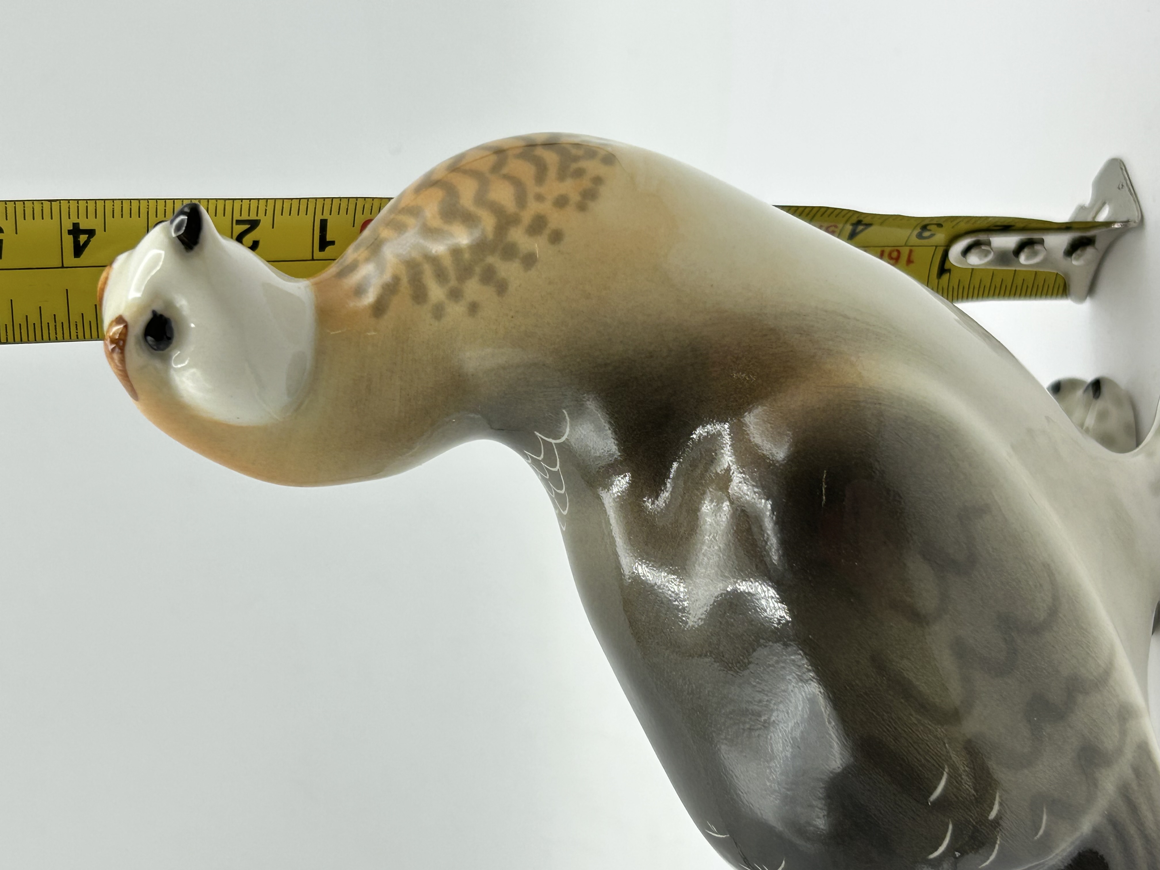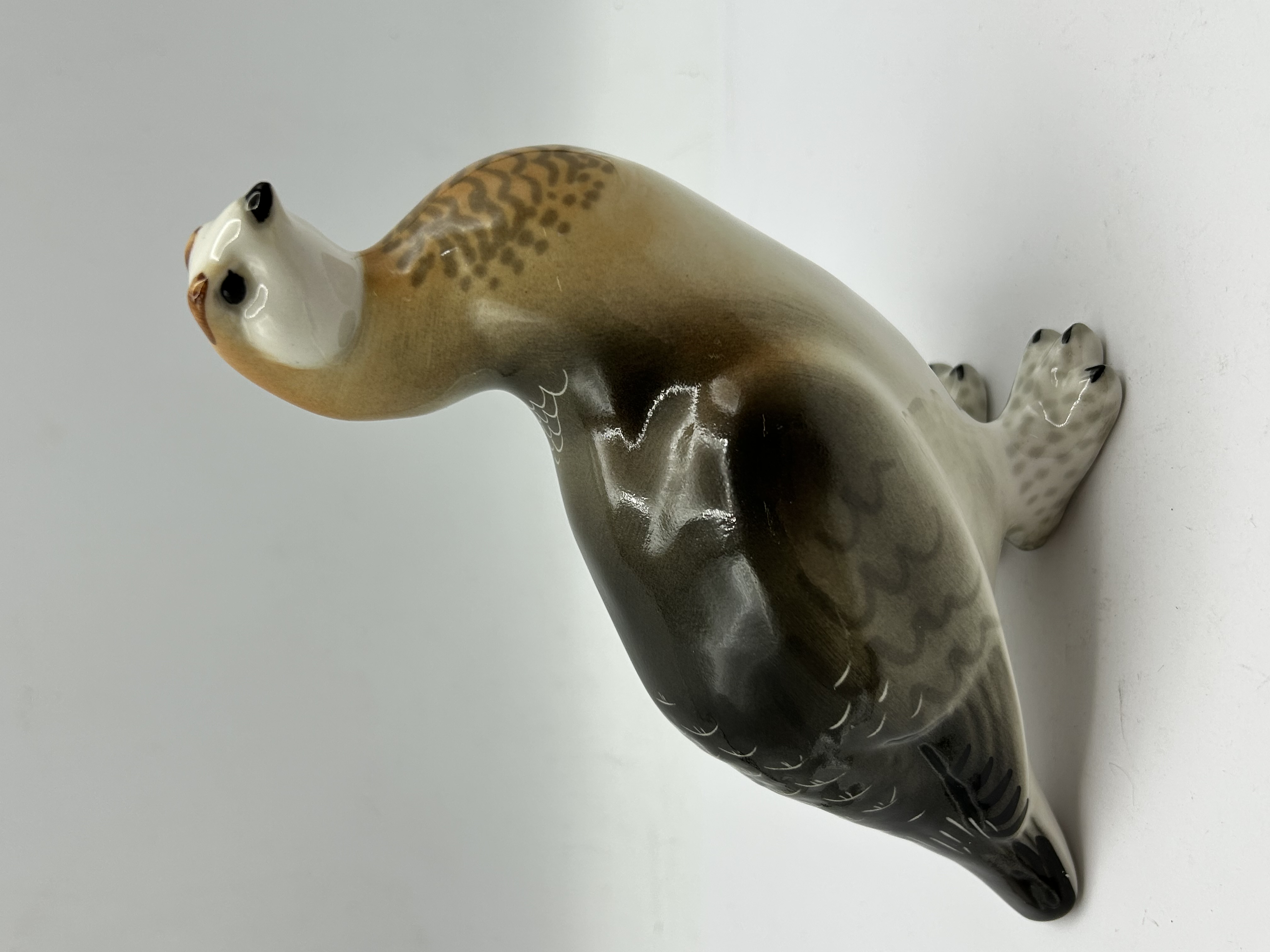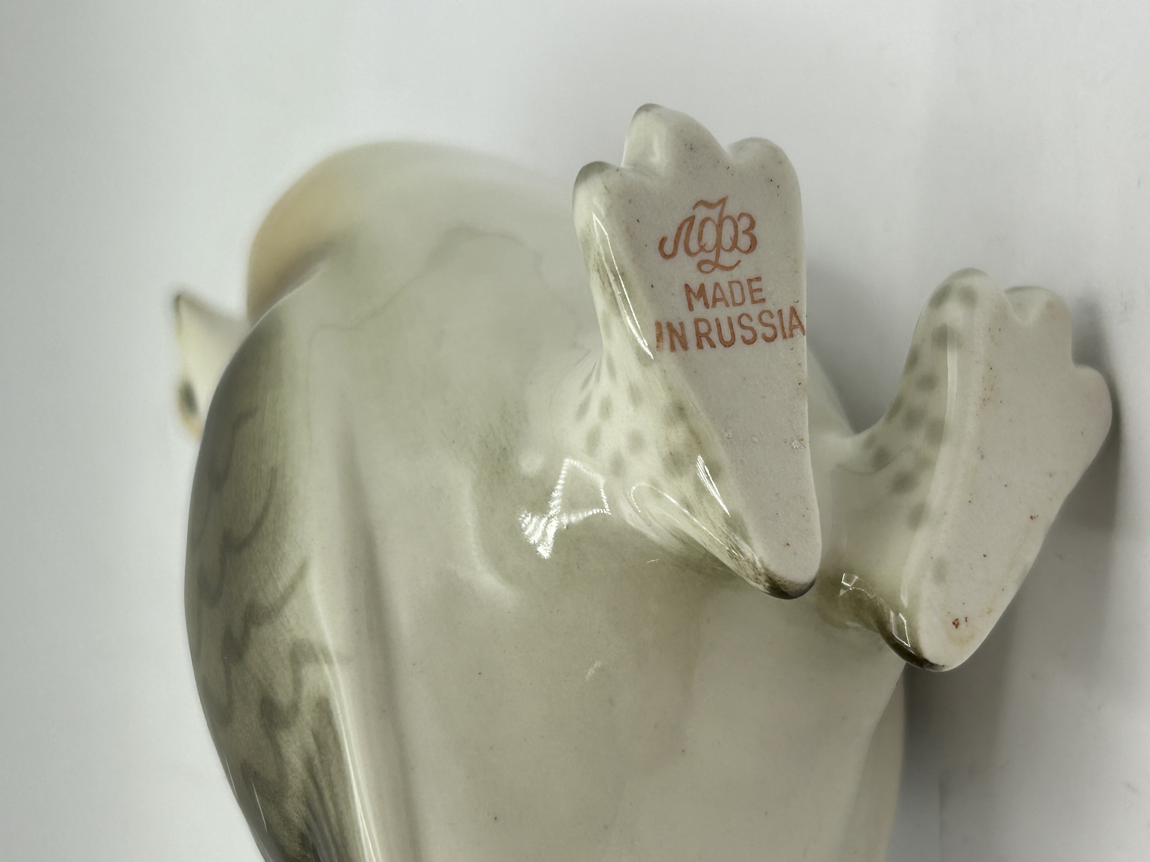 A glazed porcelain figurine of a snowy owl, depicted in a dynamic pose with its head turned over its shoulder. The piece features detailed underglaze painting in a palette of white, cream, brown, and grey to represent plumage, finished with a high-gloss glaze. The underside of the bird’s feet is marked in red with the ЛФЗ cypher for the Leningrad Porcelain Factory, accompanied by the stamp MADE IN RUSSIA.