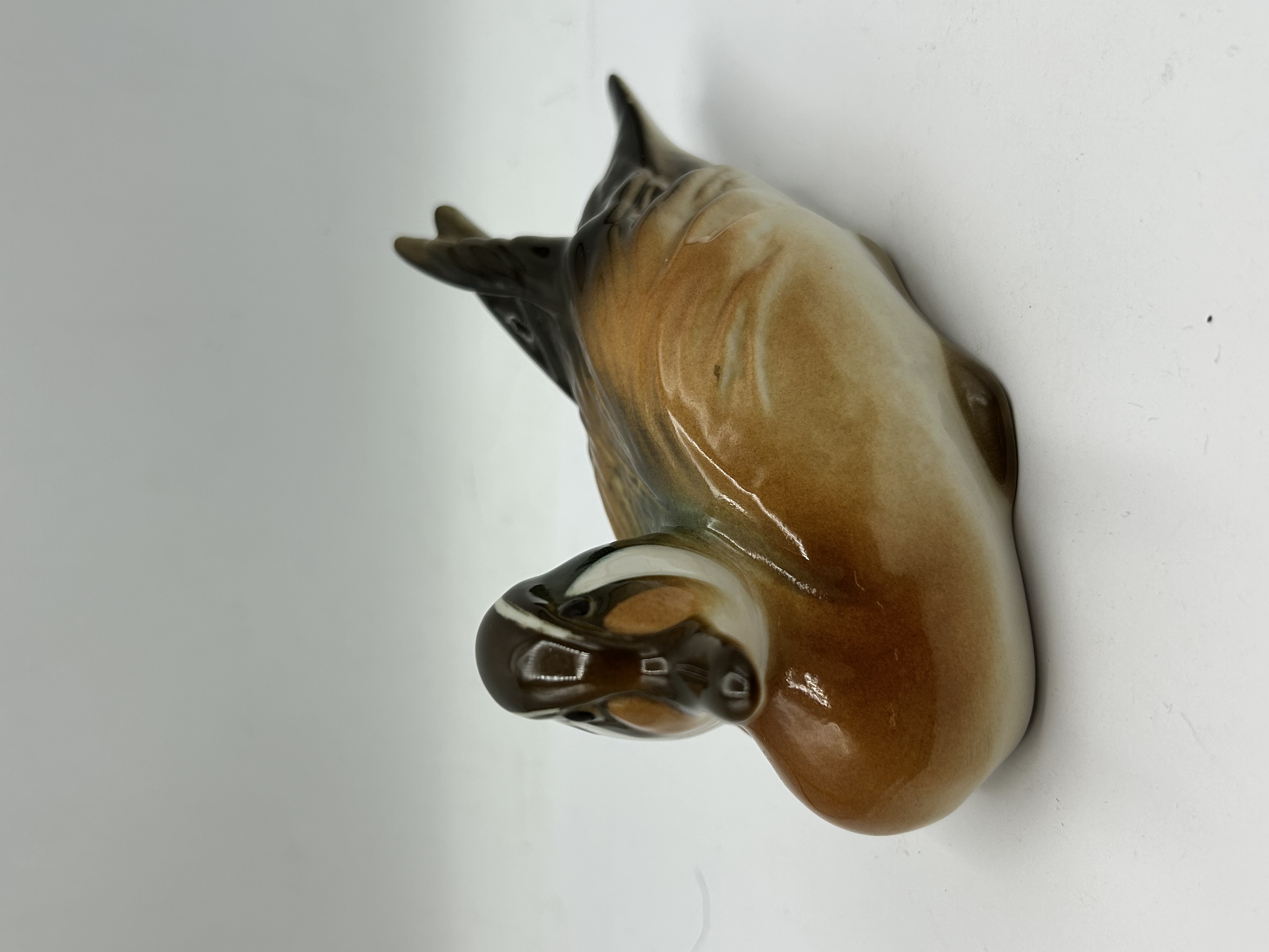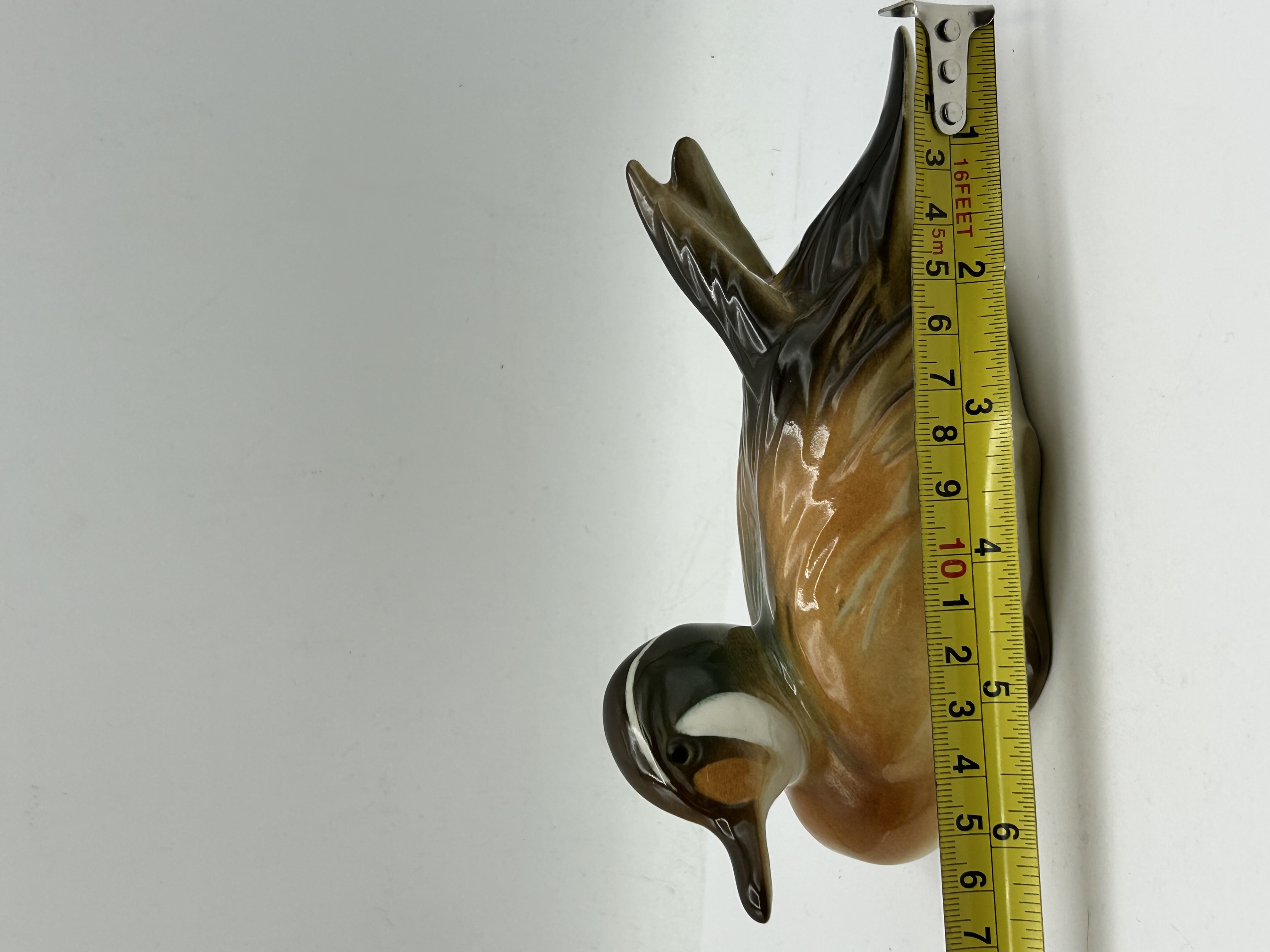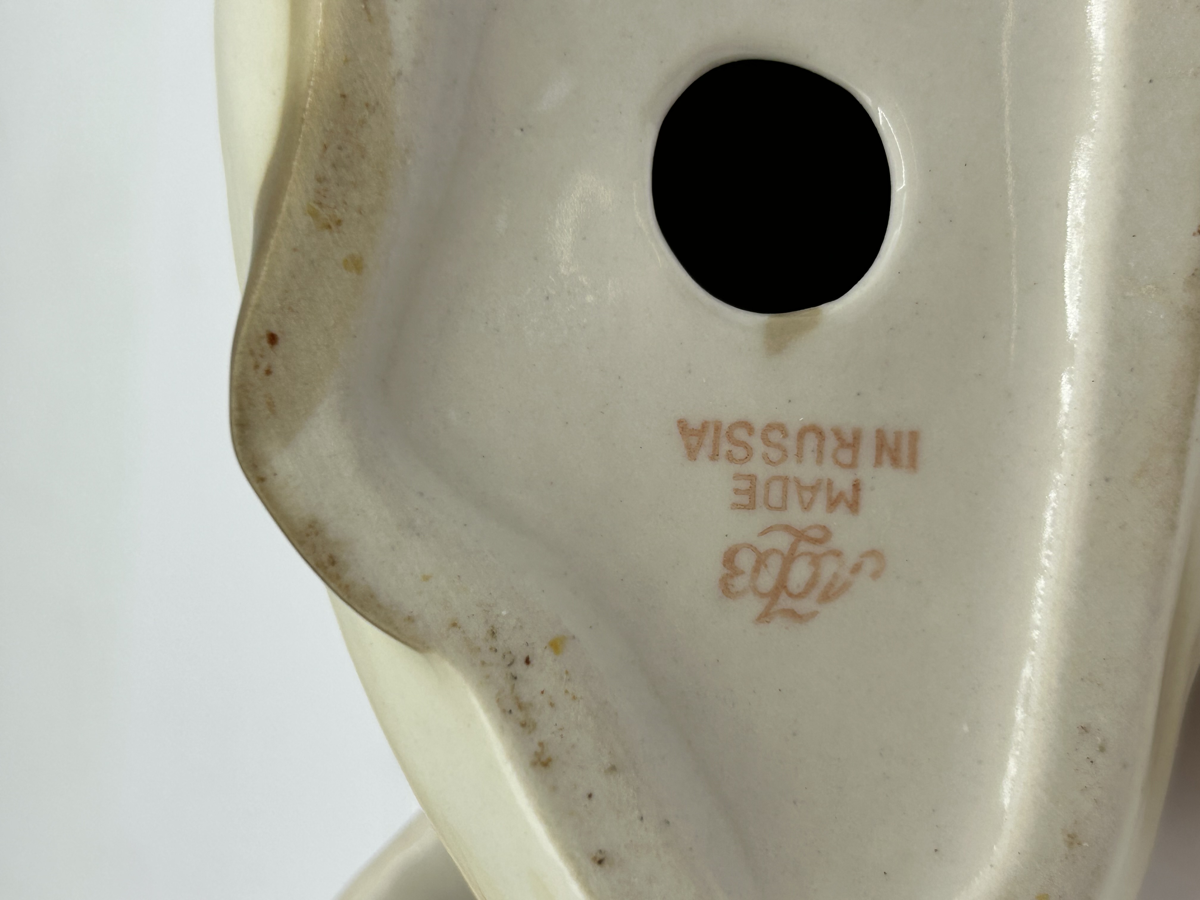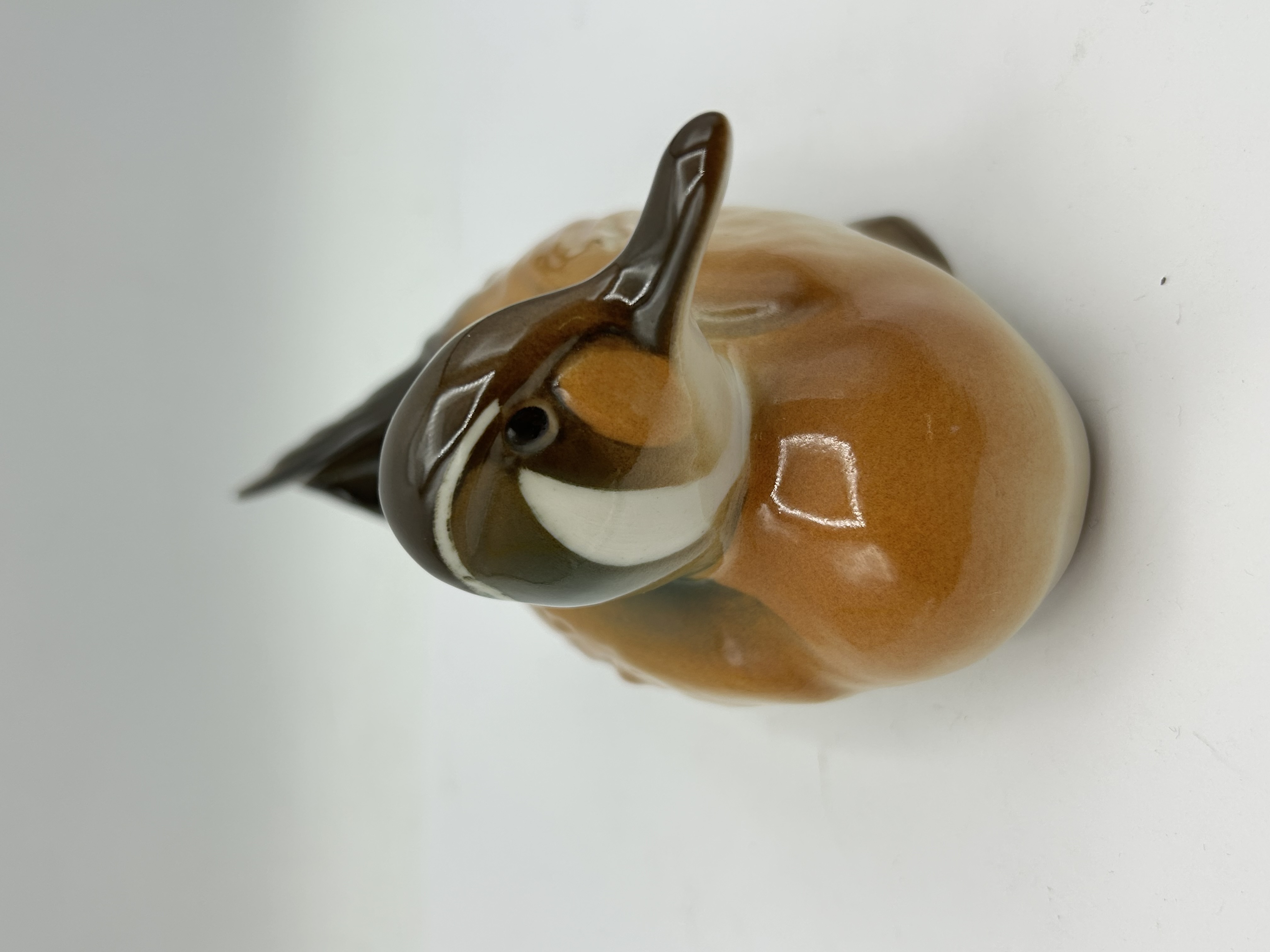 A hand-painted porcelain figurine of an Arctic Goose, also known as a Kazarka, produced by the Lomonosov Imperial Porcelain Factory. The bird is depicted in a naturalistic pose with a high-gloss glaze finish in a palette of brown, ochre, and white. The underside of the base bears a red underglaze stamp featuring the stylized LFZ monogram and the inscription MADE IN RUSSIA.