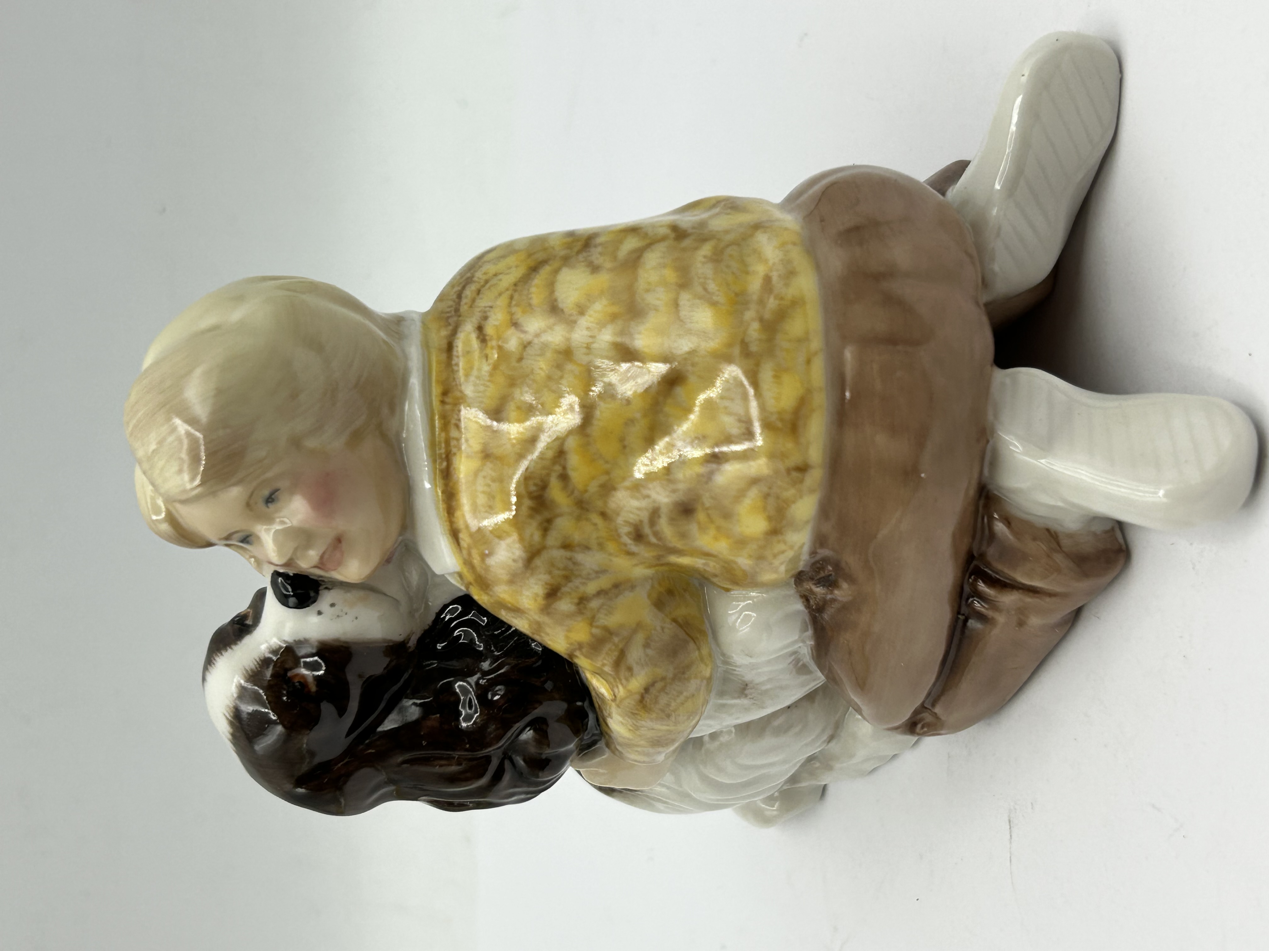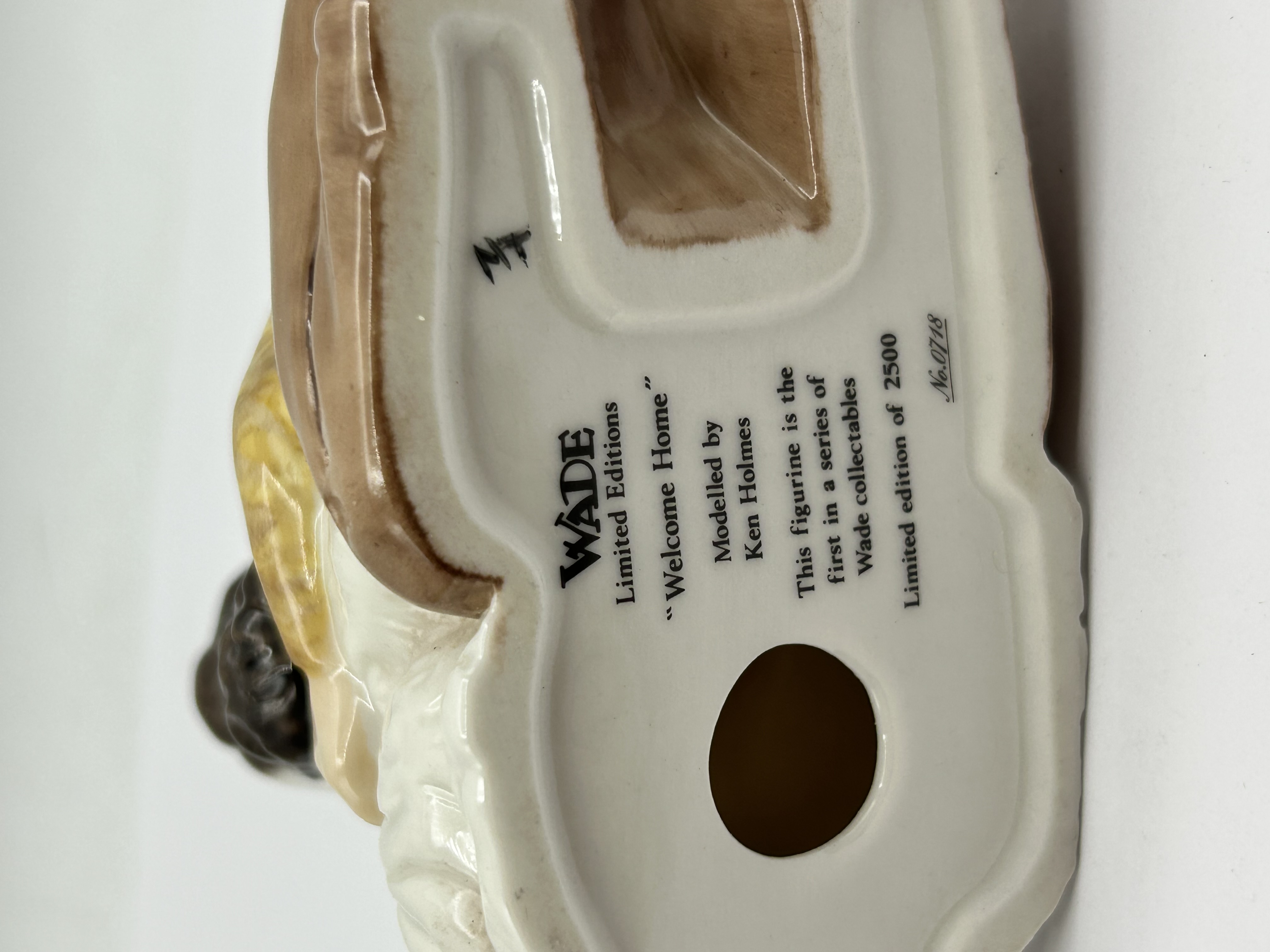 A Wade limited edition glazed porcelain figurine titled Welcome Home, modelled by Ken Holmes. The piece depicts a young boy with blond hair and rosy cheeks wearing a yellow patterned sweater and brown trousers, kneeling to embrace a liver-and-white spaniel. The figurine is finished with a high-gloss glaze. The underside bears a black printed backstamp identifying the piece as part of a Wade limited edition series, noting it as the first in a series of Wade collectables. It is hand-numbered 0718 of a limited edition of 2500. A small hand-painted black mark is also present on the base.