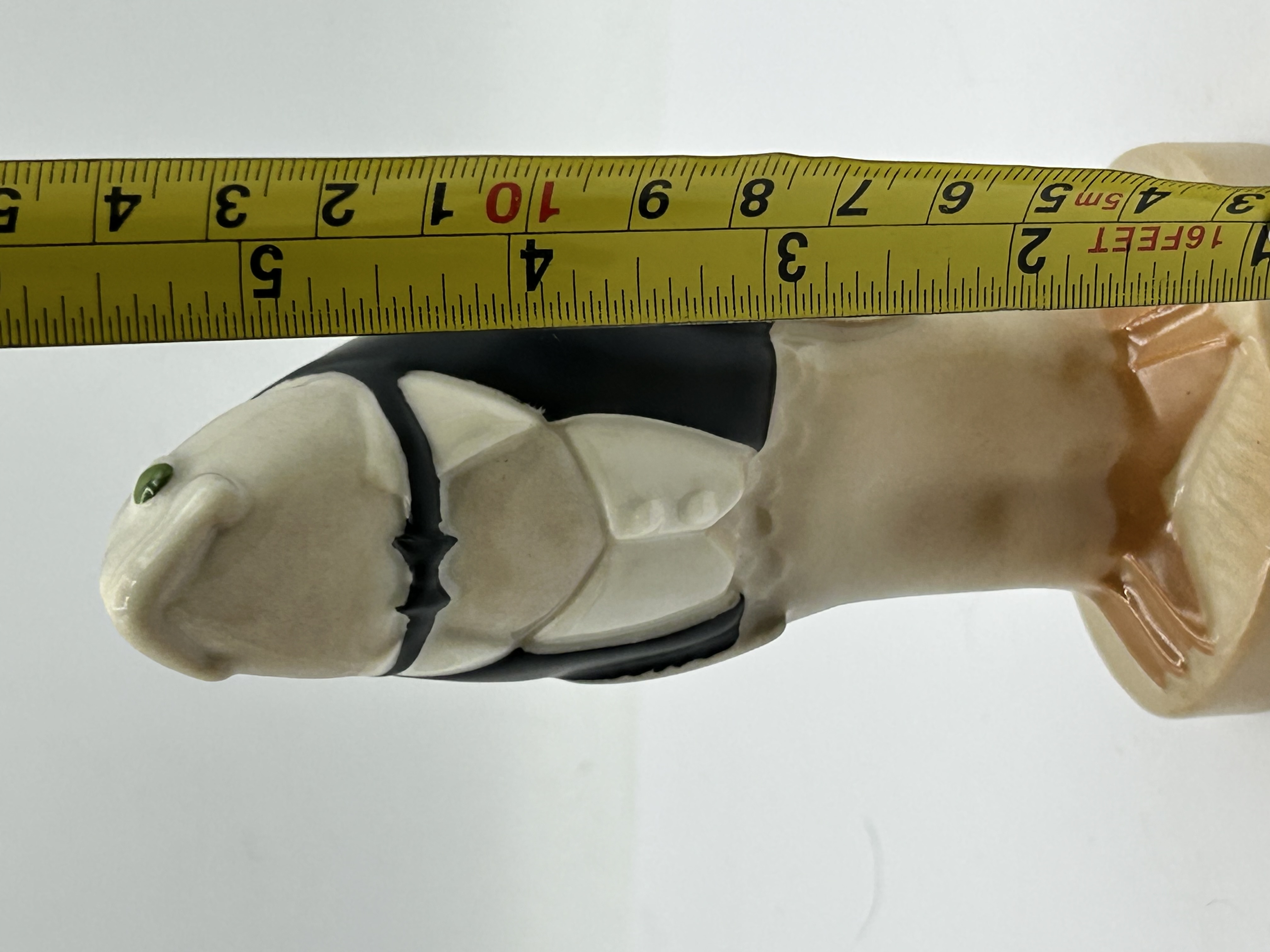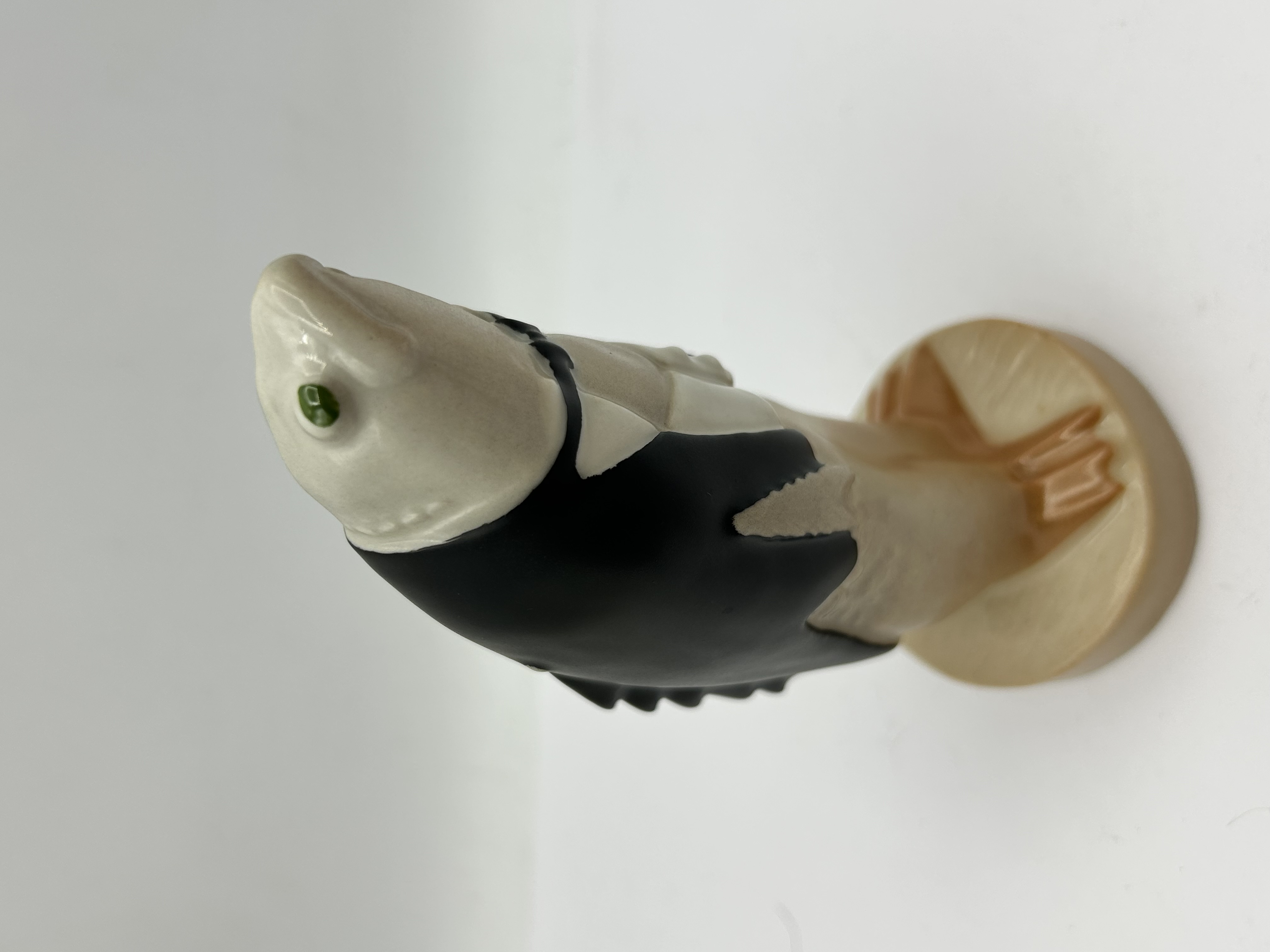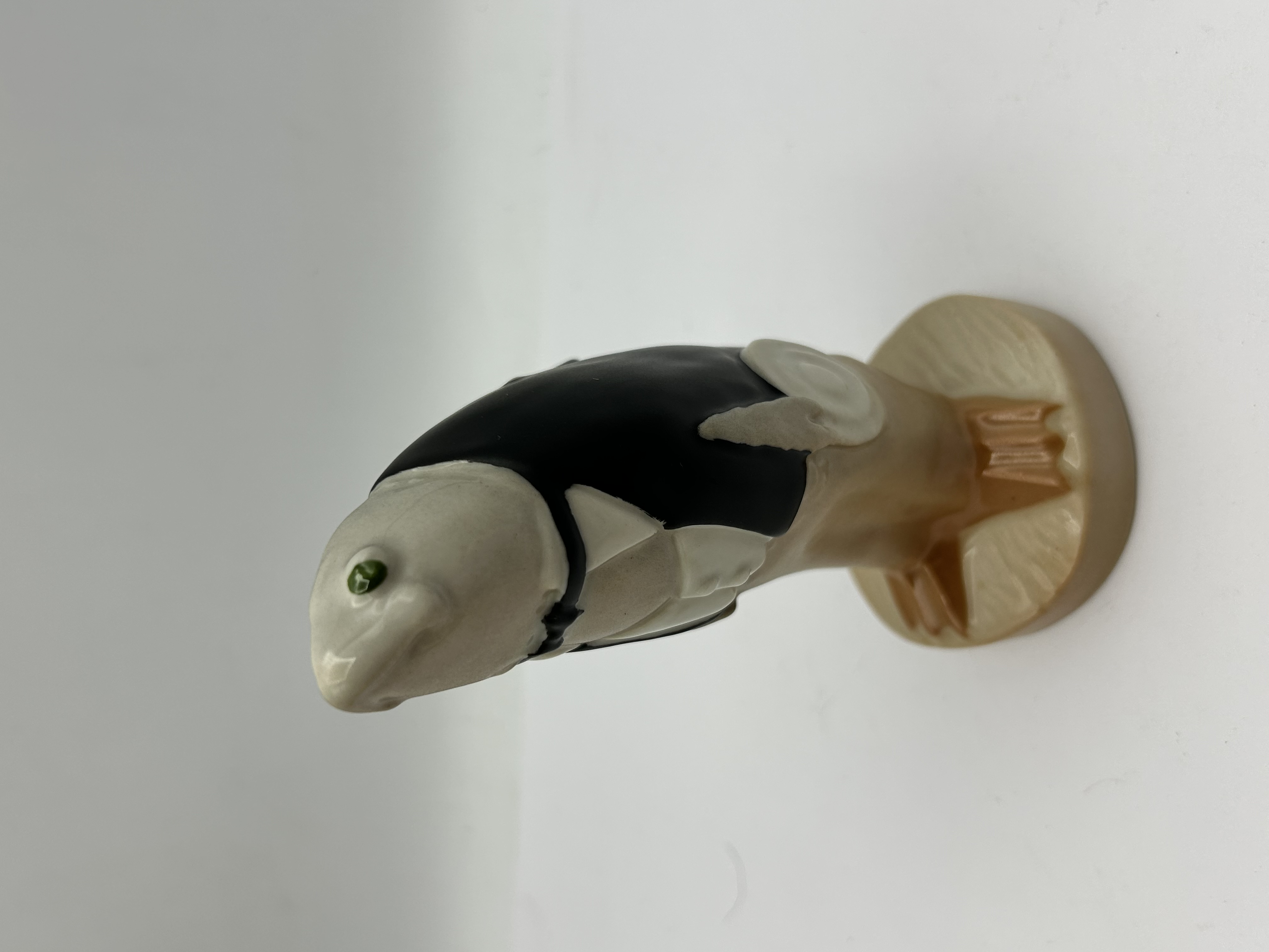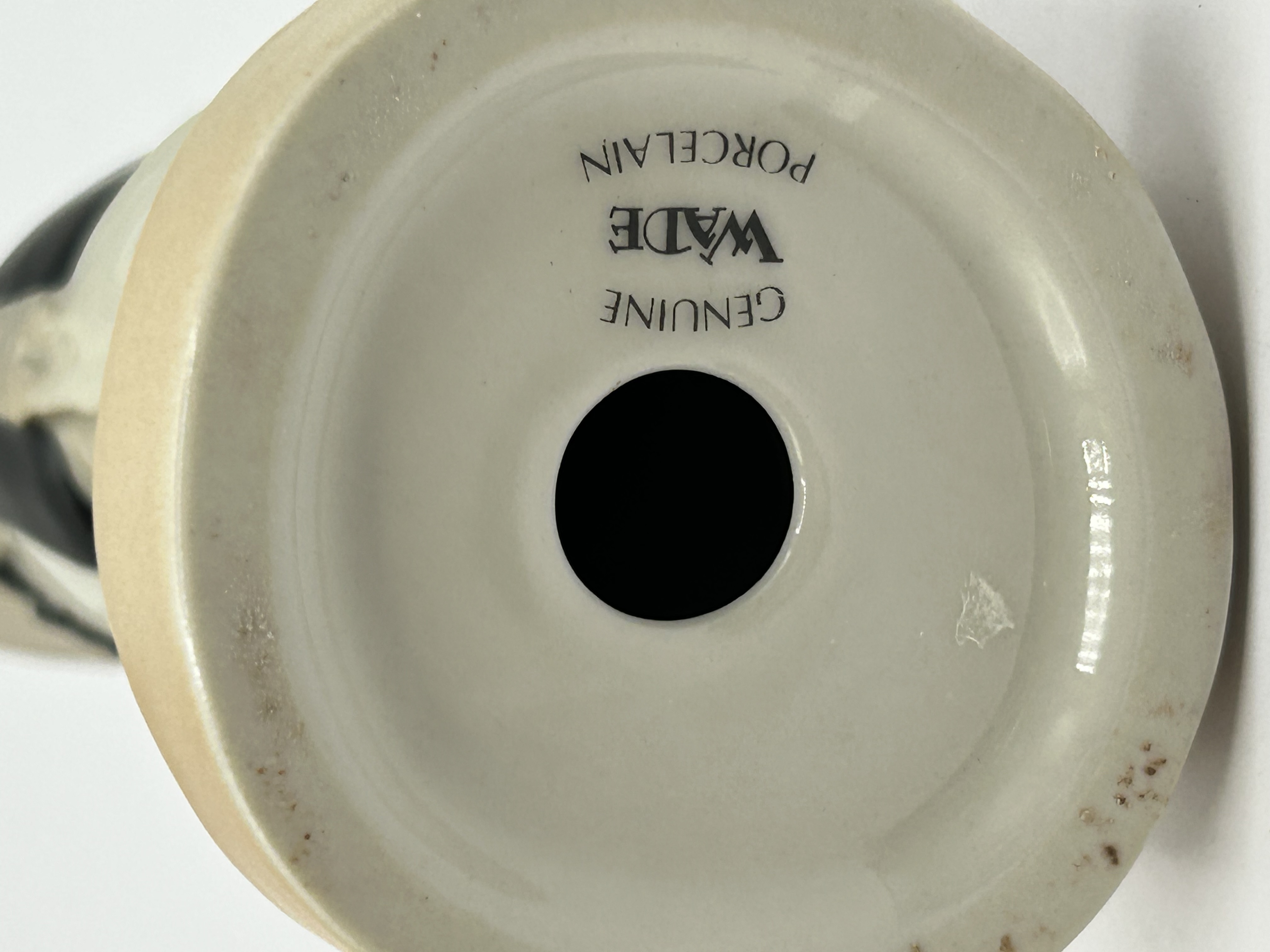 A Wade porcelain figurine depicting an anthropomorphic bird, resembling a penguin or puffin, dressed in formal attire. The figure is modelled wearing a black tuxedo jacket, a white collared shirt, and a black bow tie. The piece features hand-painted accents, including green eyes and orange webbed feet, and is mounted on a circular integral base. The underside of the base bears the GENUINE WADE PORCELAIN backstamp and shows a central circular aperture.