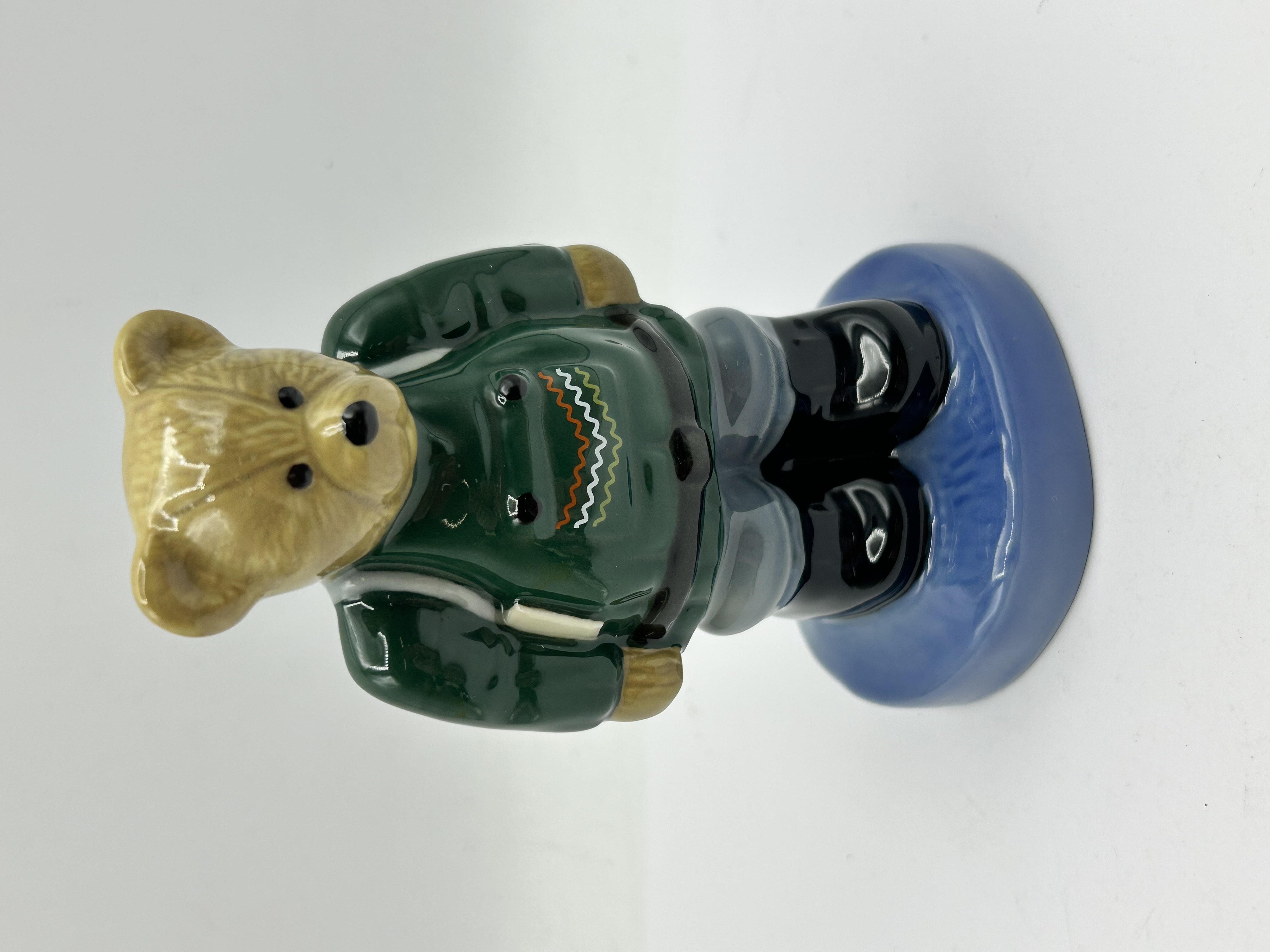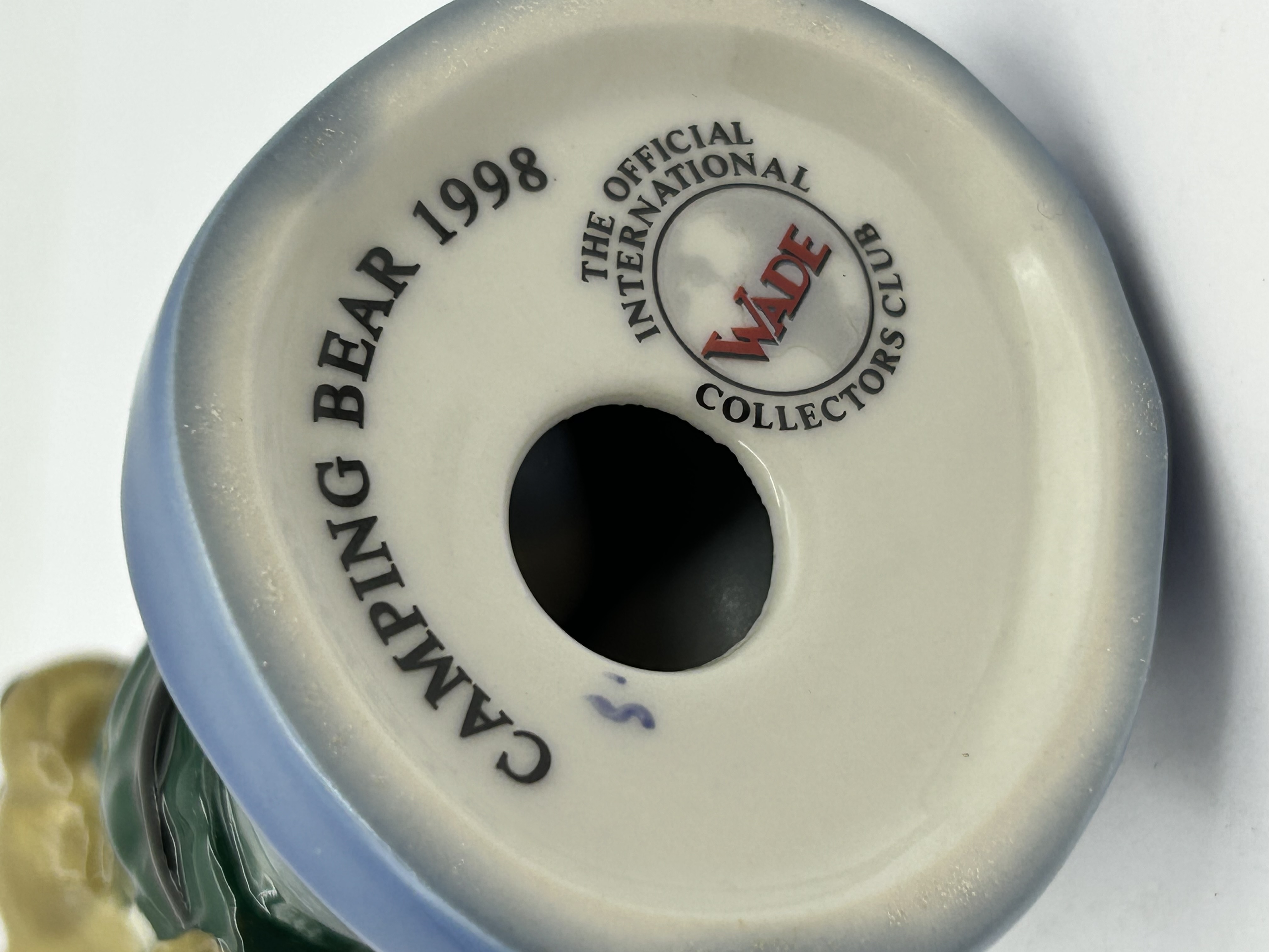 A ceramic figurine titled Camping Bear 1998, produced by Wade for The Official International Wade Collectors Club. The anthropomorphic bear is finished in a high-gloss glaze and is depicted wearing a dark green sweater with an orange and white zigzag pattern, greyish-blue trousers, and black boots. The figure stands on a circular light-blue base. The underside of the hollow base features the printed title CAMPING BEAR 1998 and the insignia for THE OFFICIAL INTERNATIONAL WADE COLLECTORS CLUB with the Wade logo.