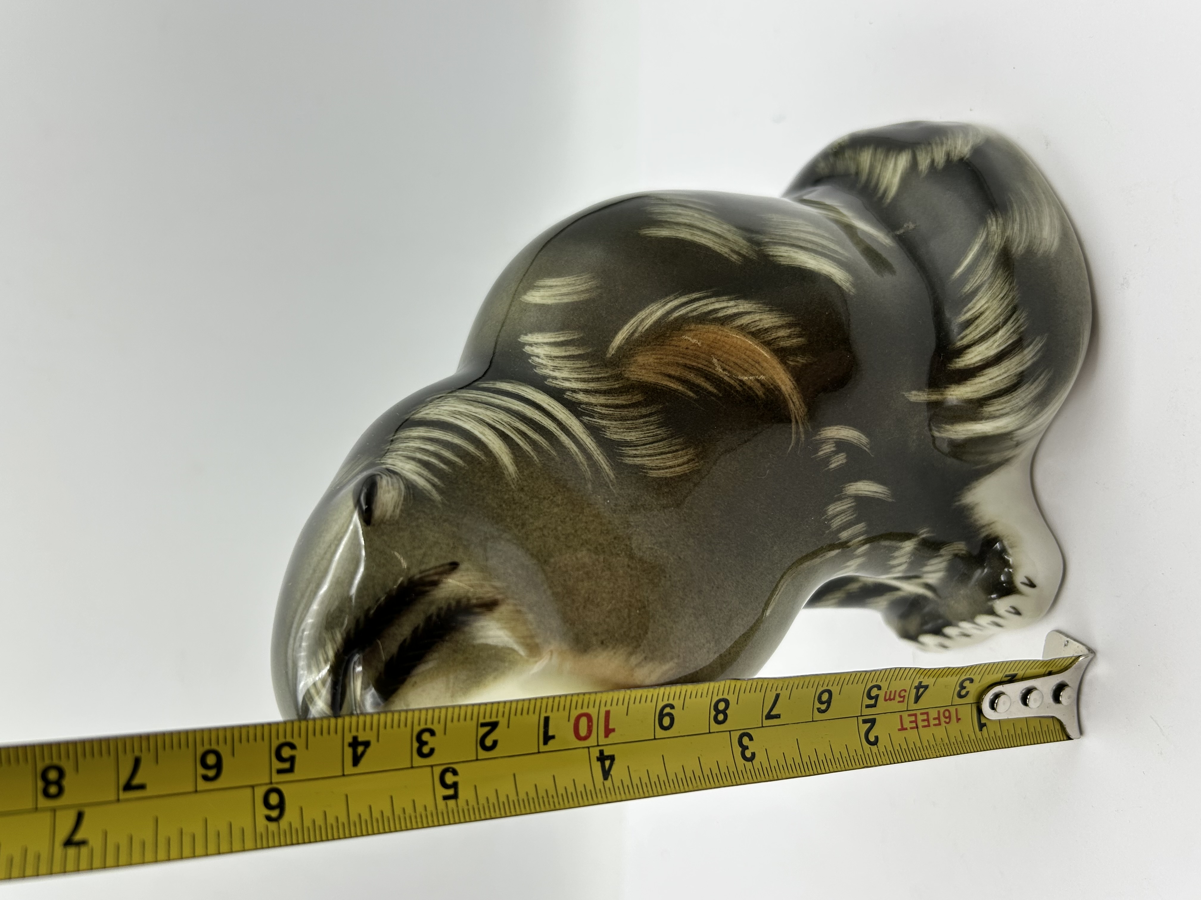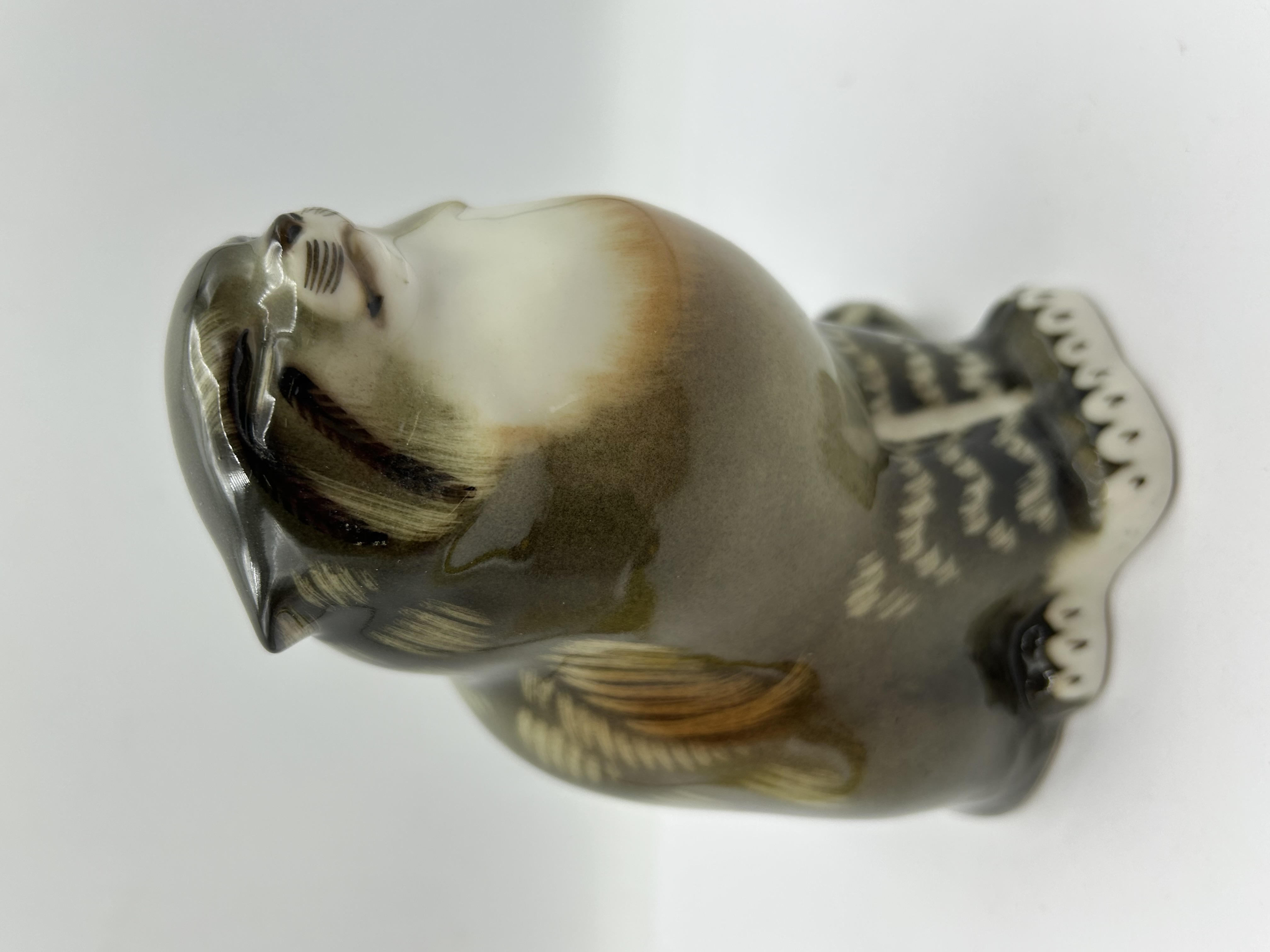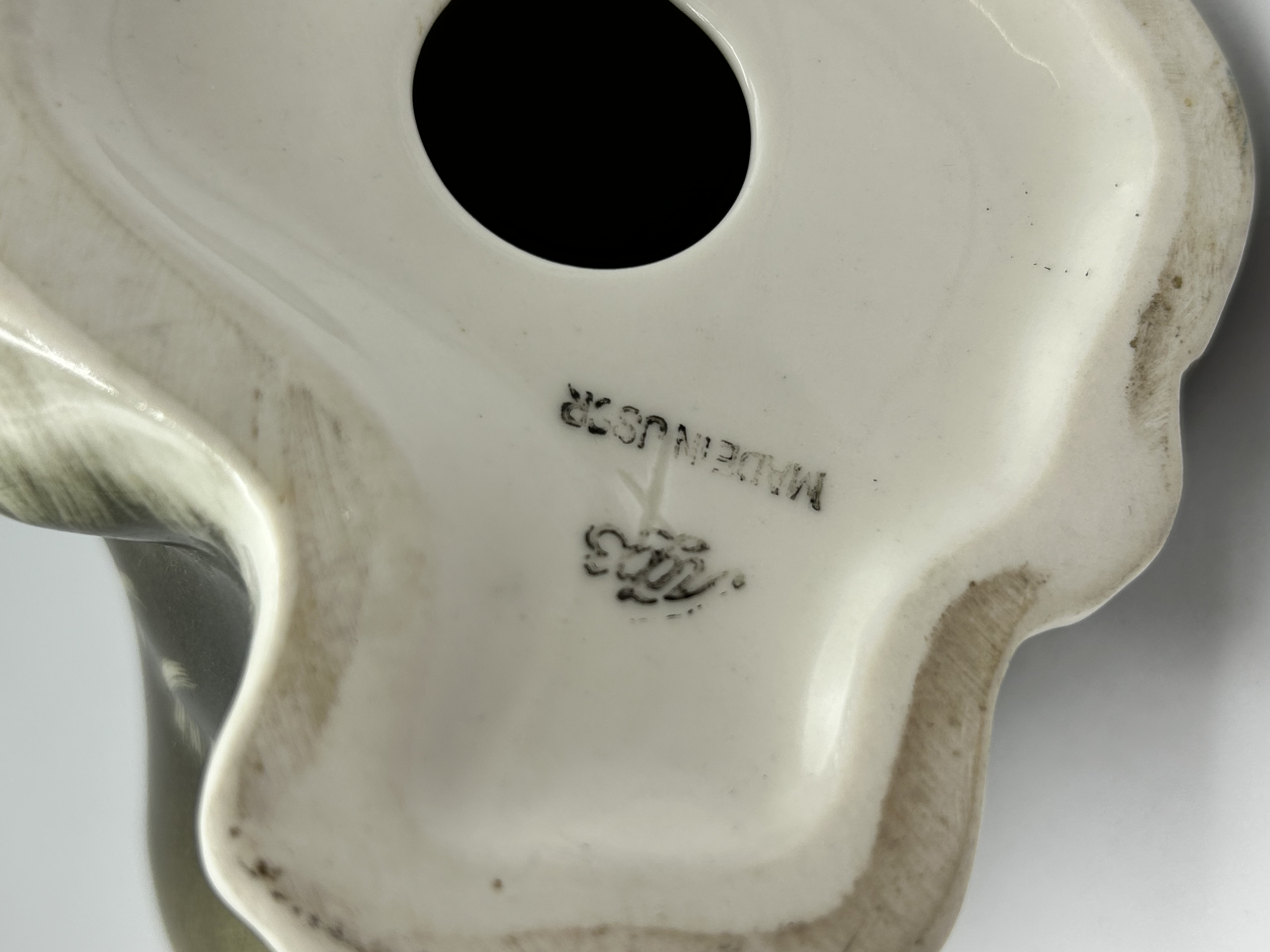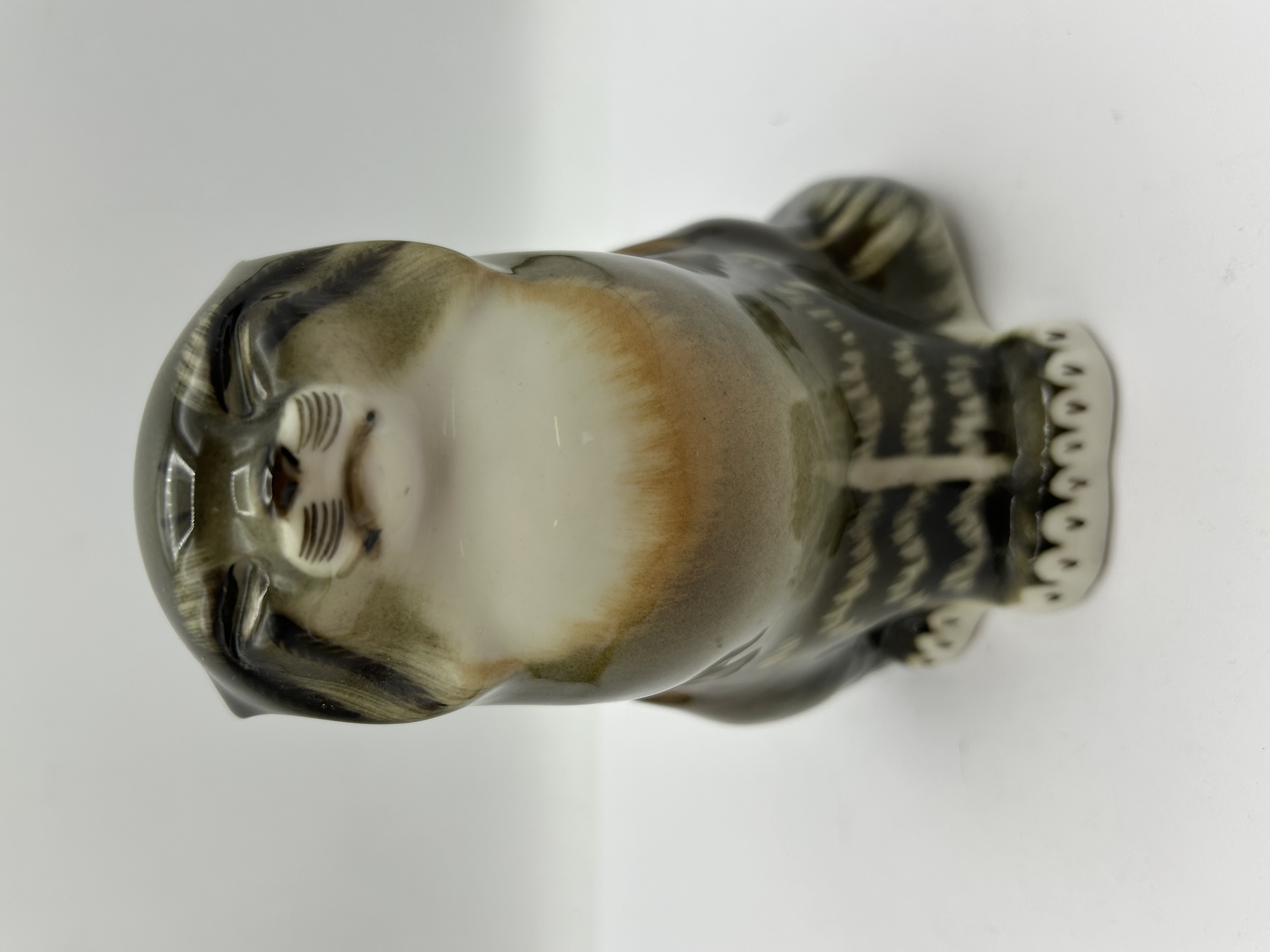 A mid-20th-century porcelain figurine produced by the Lomonosov Porcelain Factory, depicting a Pallas cat, also known as a manul. The piece is finished in a high-gloss glaze with a palette of olive, brown, and cream tones. It features painted details representing the animal’s fur and facial features. The underside of the unglazed base is stamped in black with the manufacturer’s monogram and the text MADE IN USSR.