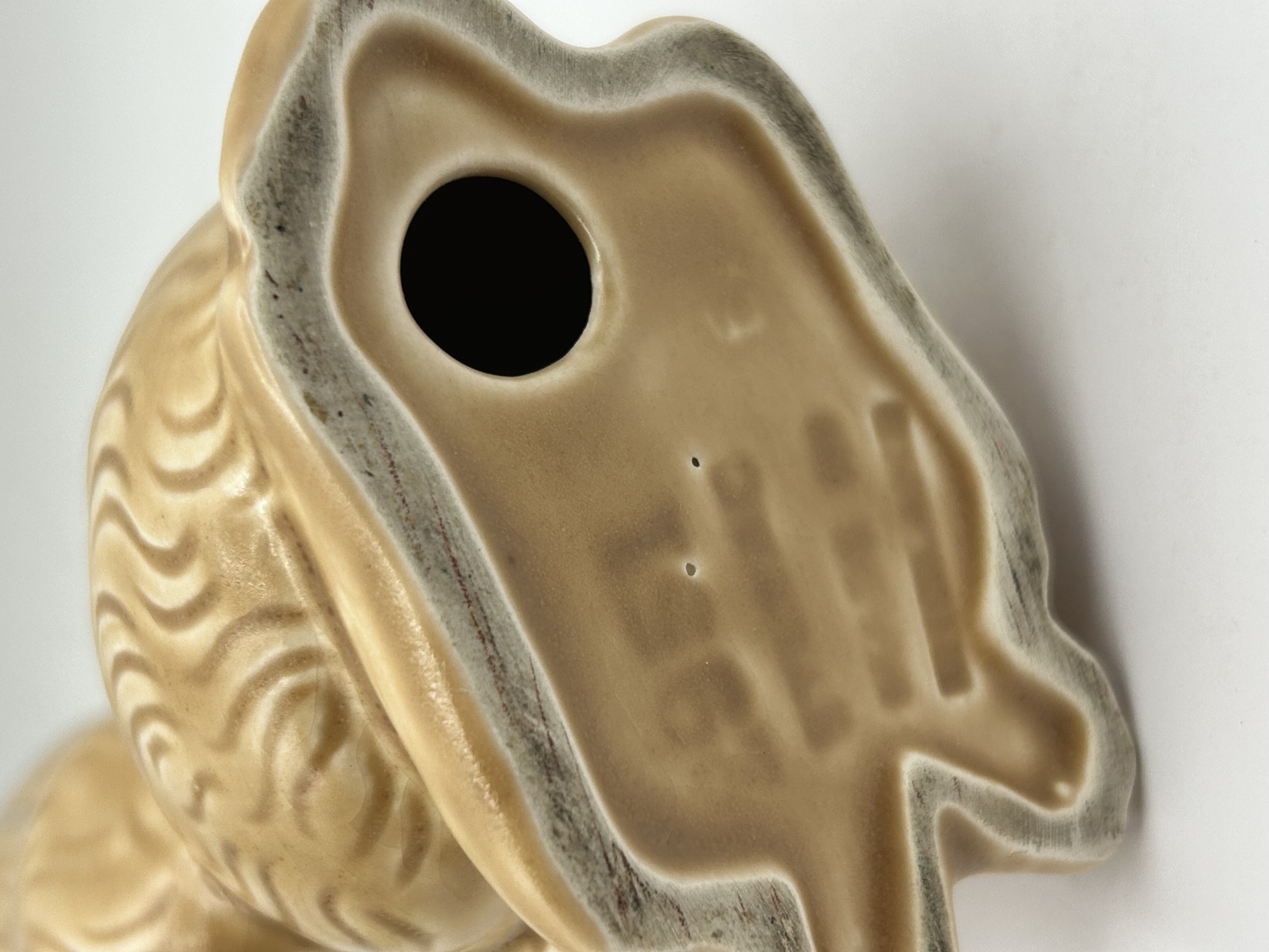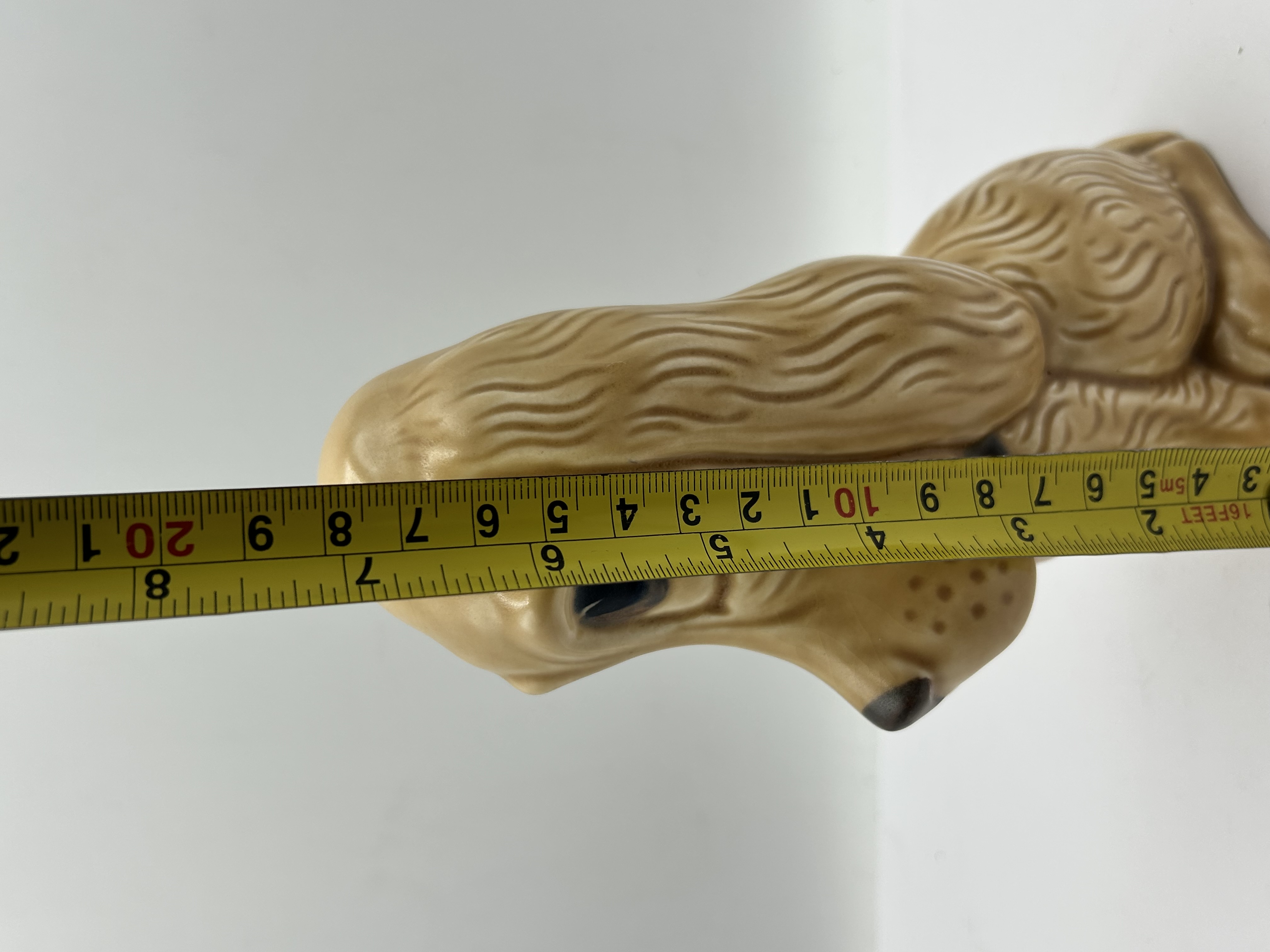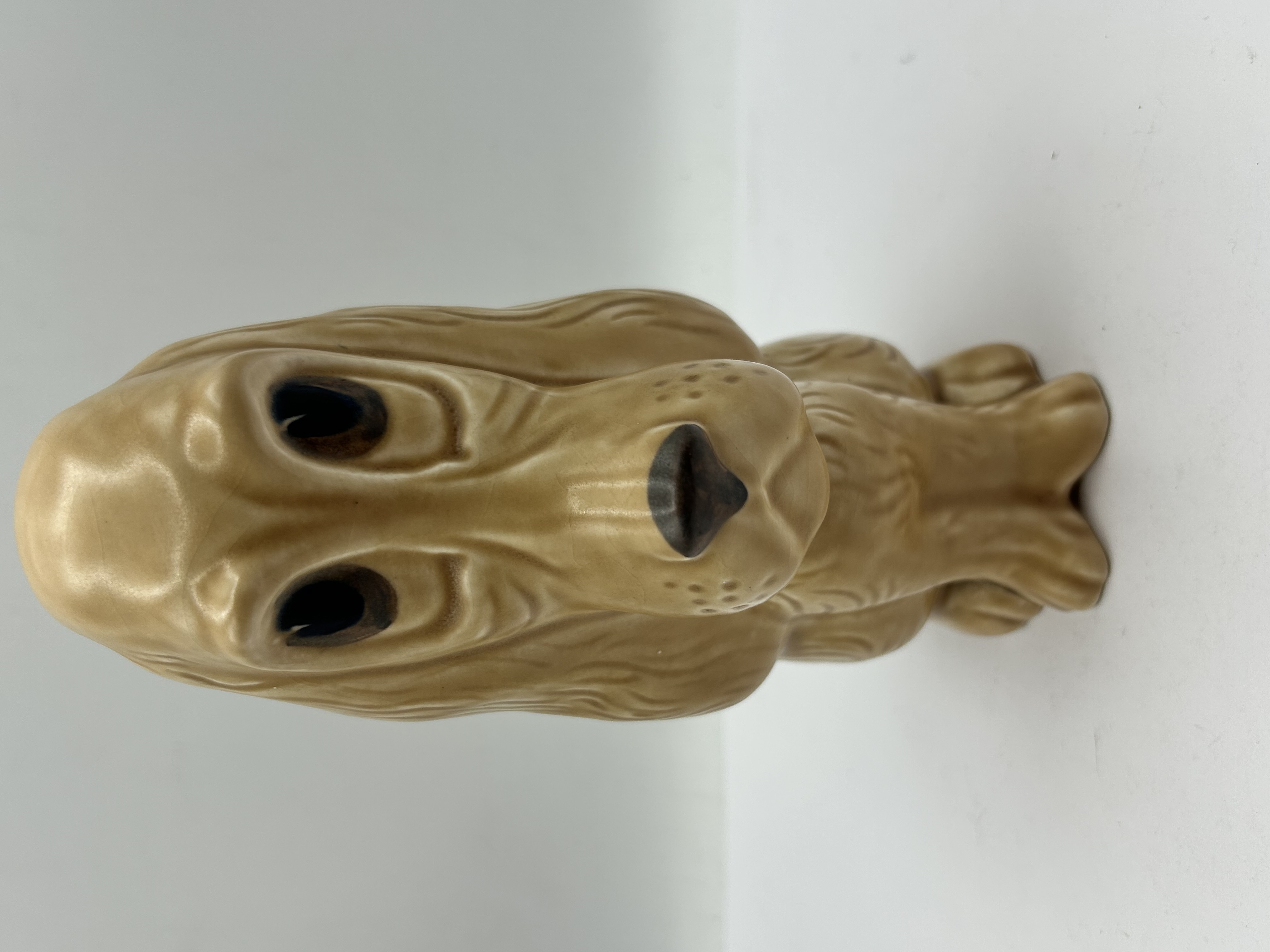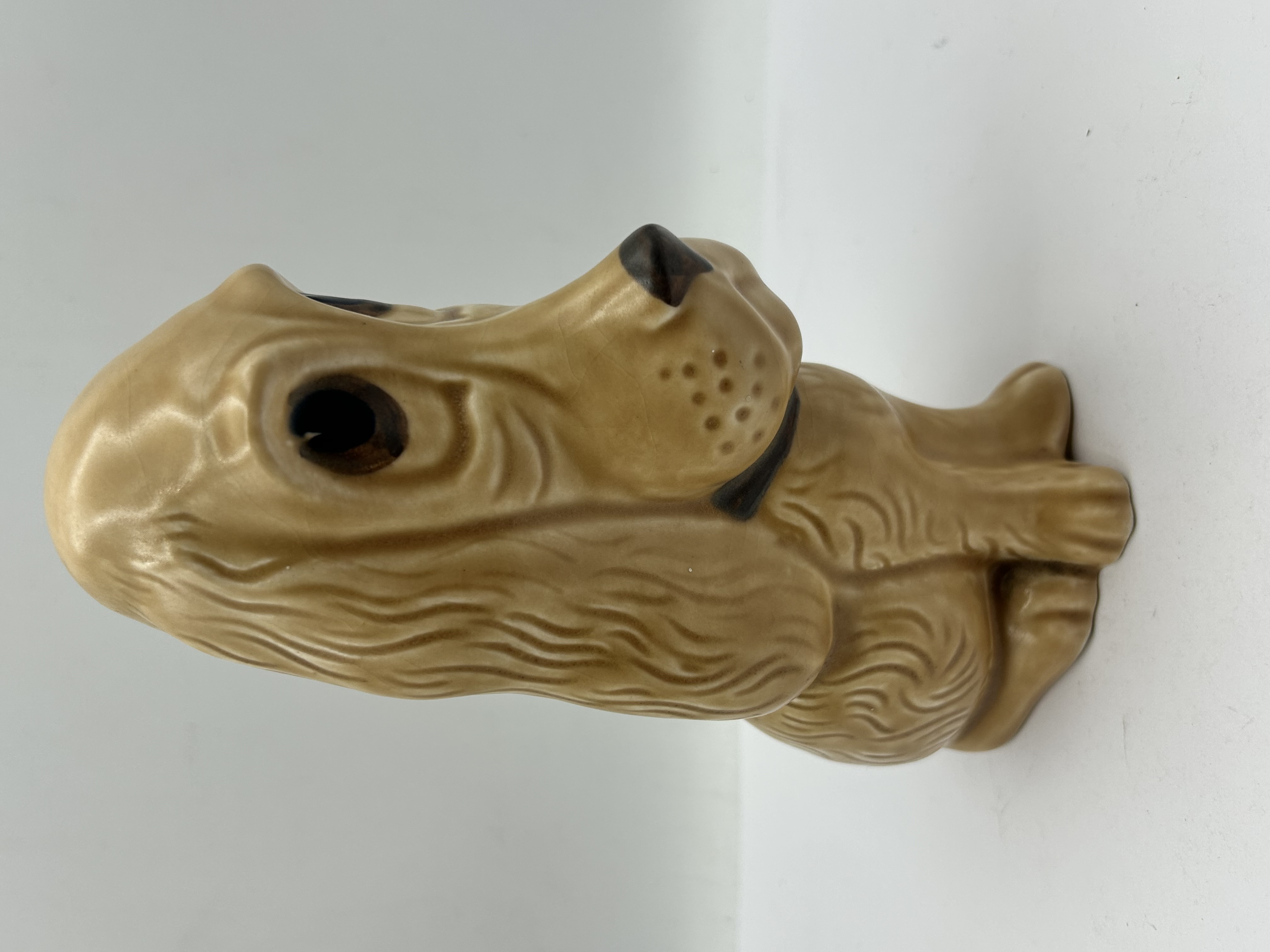 A glazed ceramic figurine depicting a seated Cocker Spaniel, finished in a tan or buff colour. The piece features dark brown painted accents to the eyes, nose, and collar. The body and long ears are detailed with moulded textured, wavy fur. The hollow underside includes a single circular aperture and an impressed USA mark.