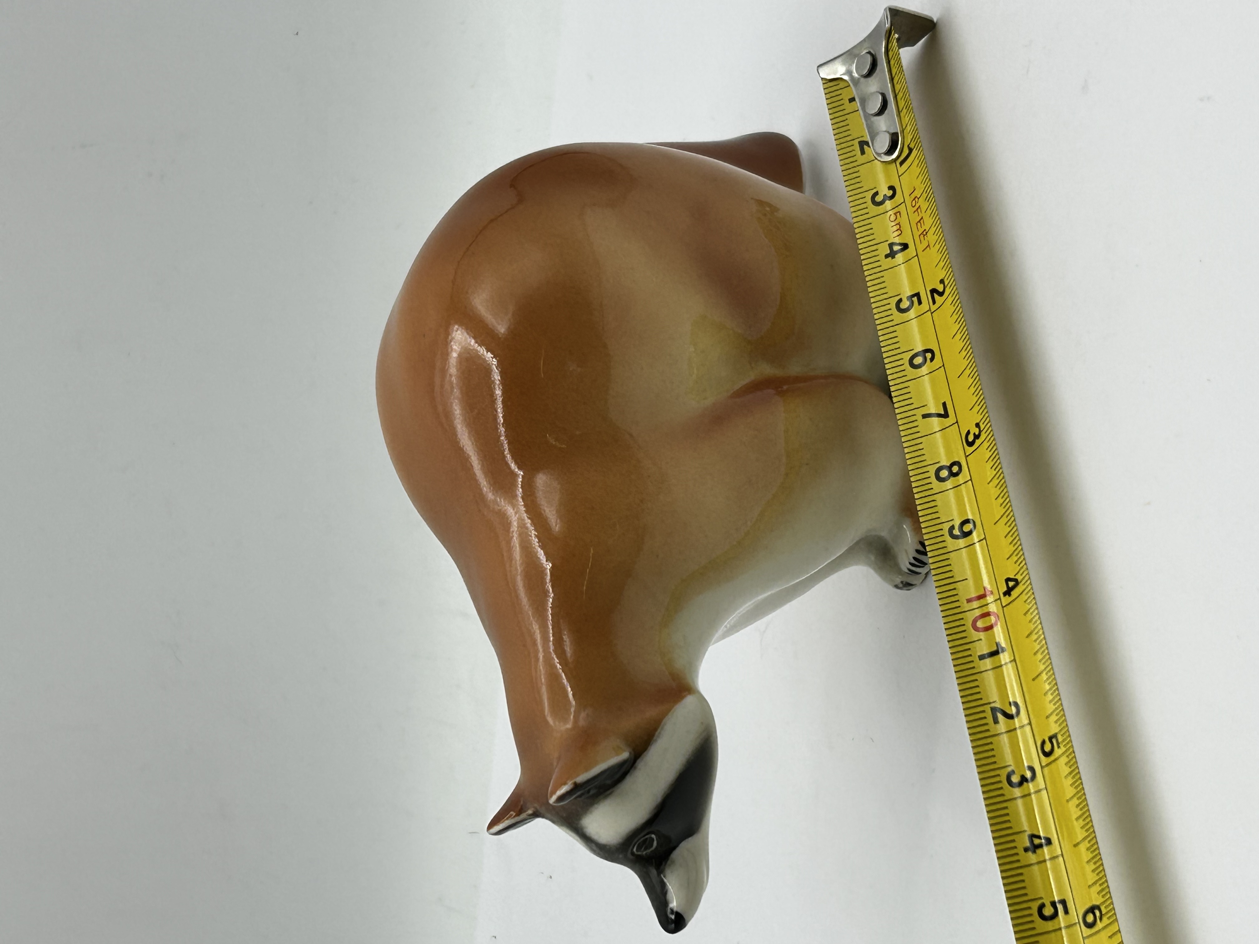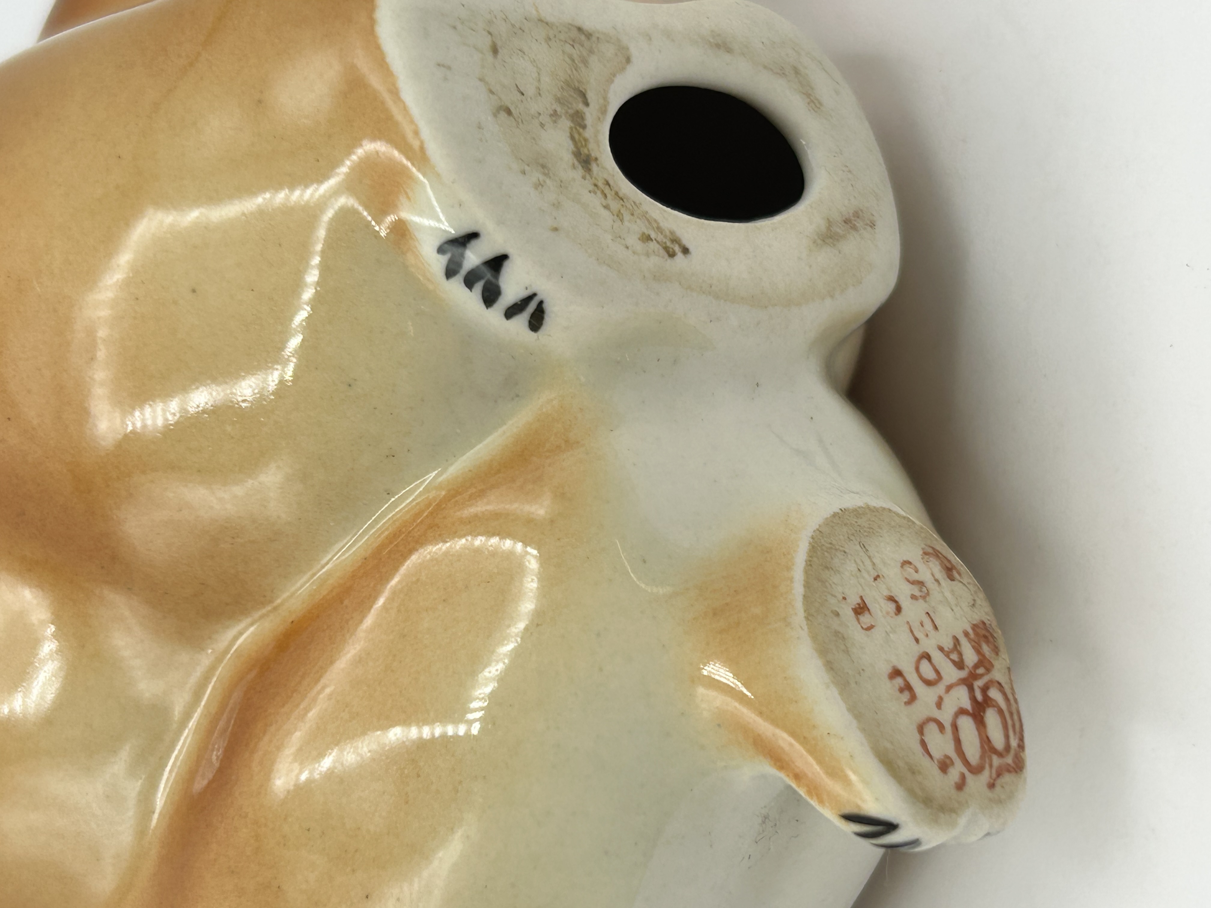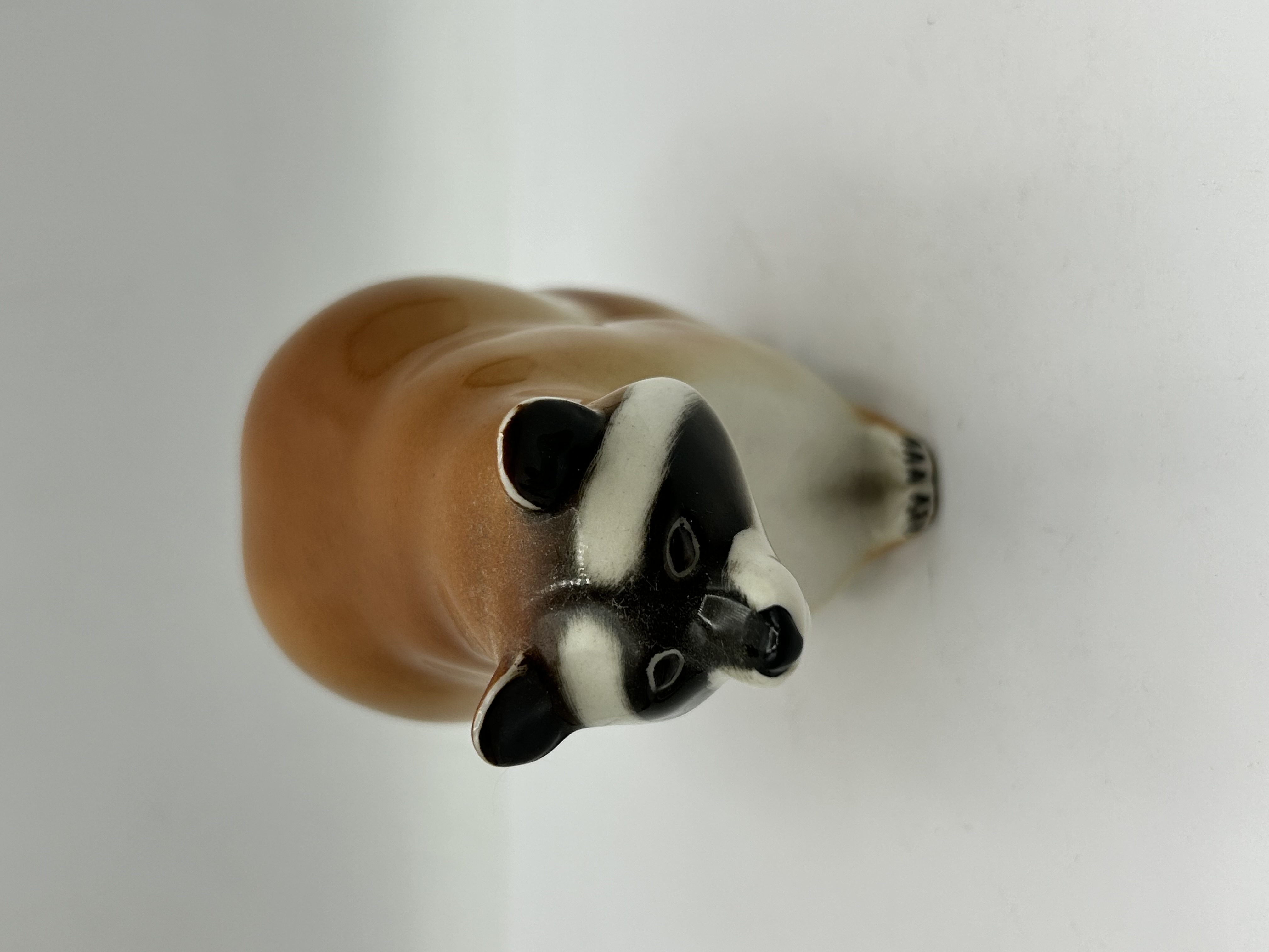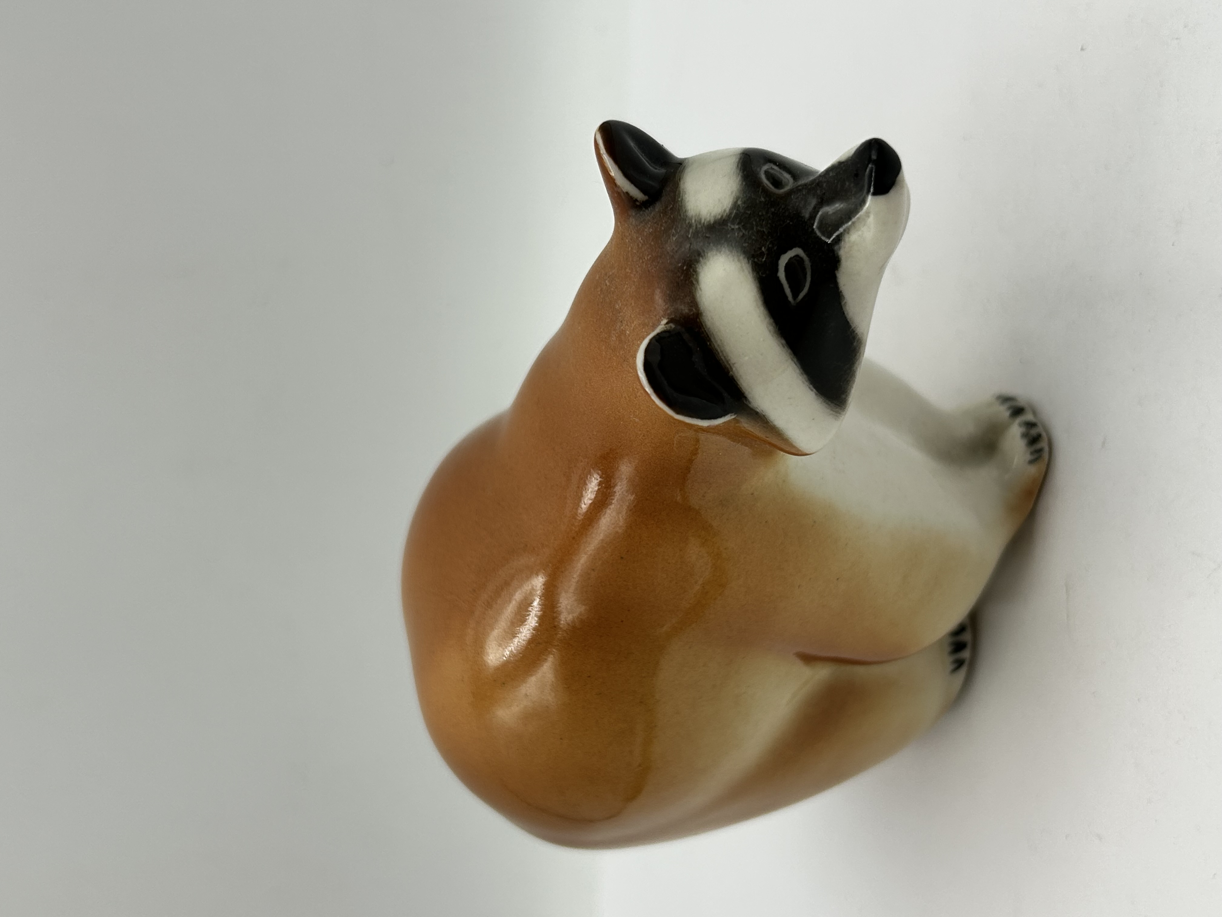 A Lomonosov porcelain figurine depicting a seated raccoon, rendered in a realistic animalier style. The piece is constructed from glazed porcelain with a high-gloss finish. The hand-painted tawny brown and cream colouration is accented with black detailing to the facial mask and paws. The underside of the base bears a red MADE IN USSR export stamp and the circular Lomonosov factory logo, alongside hand-painted black numerals.