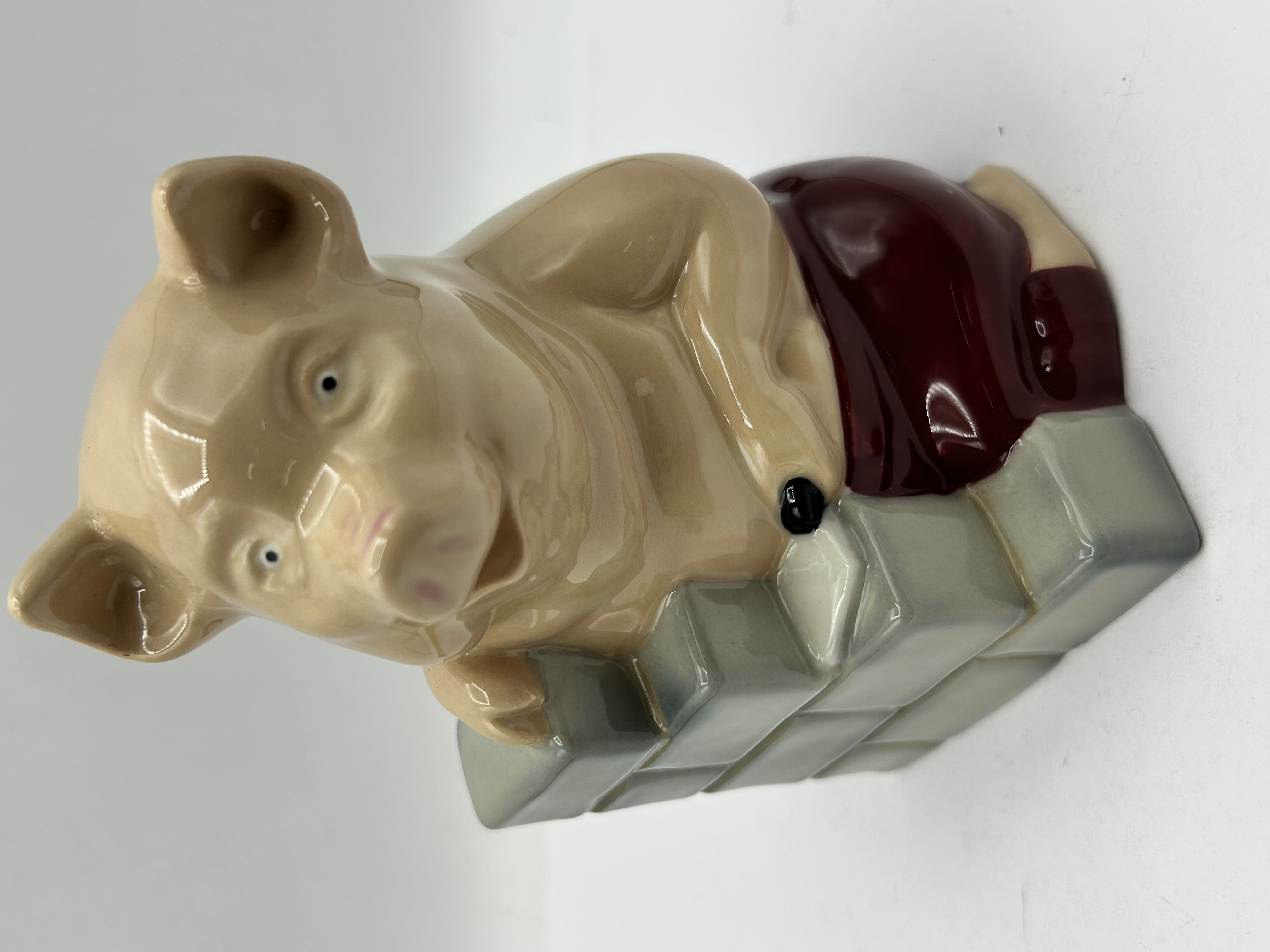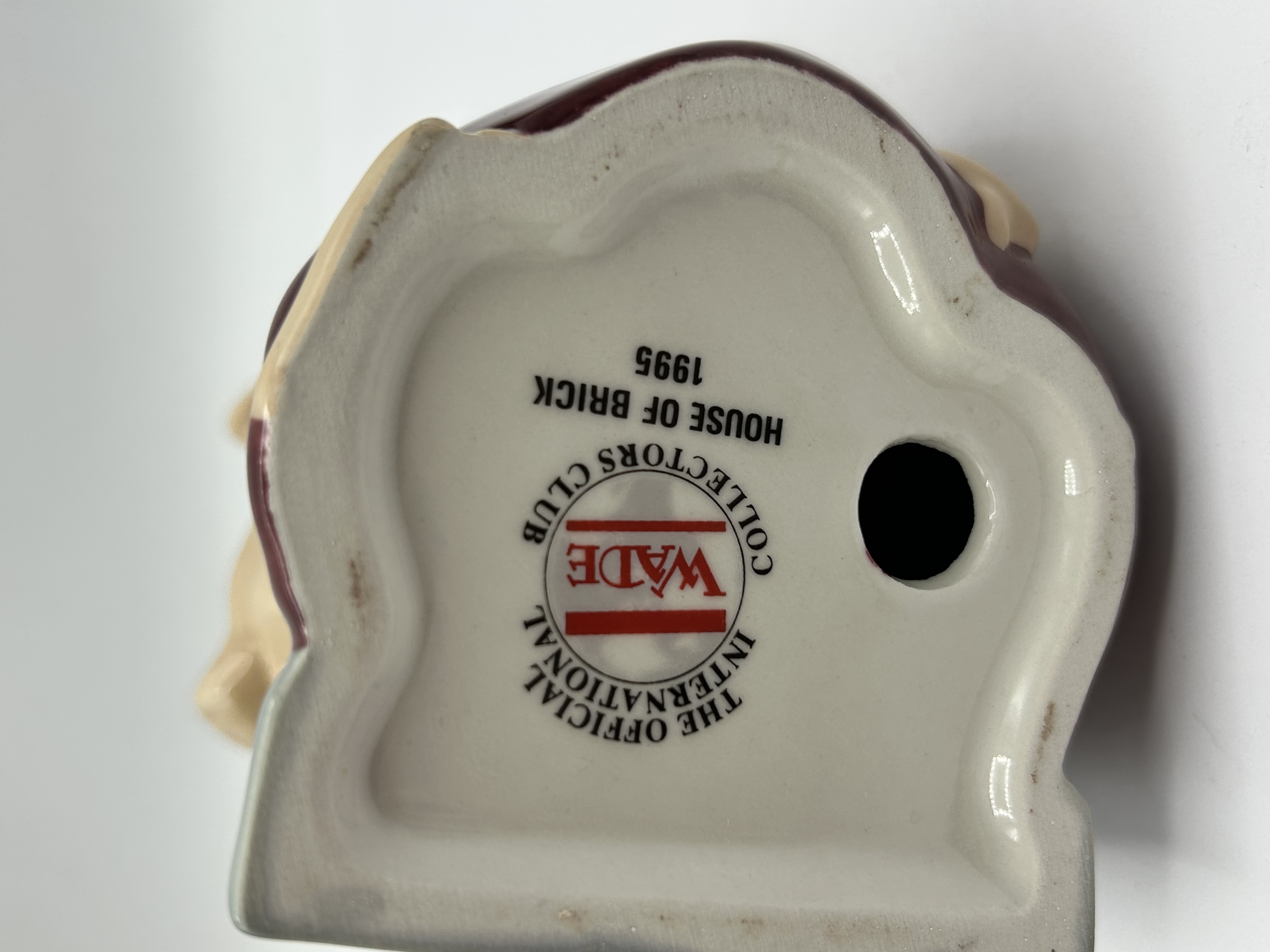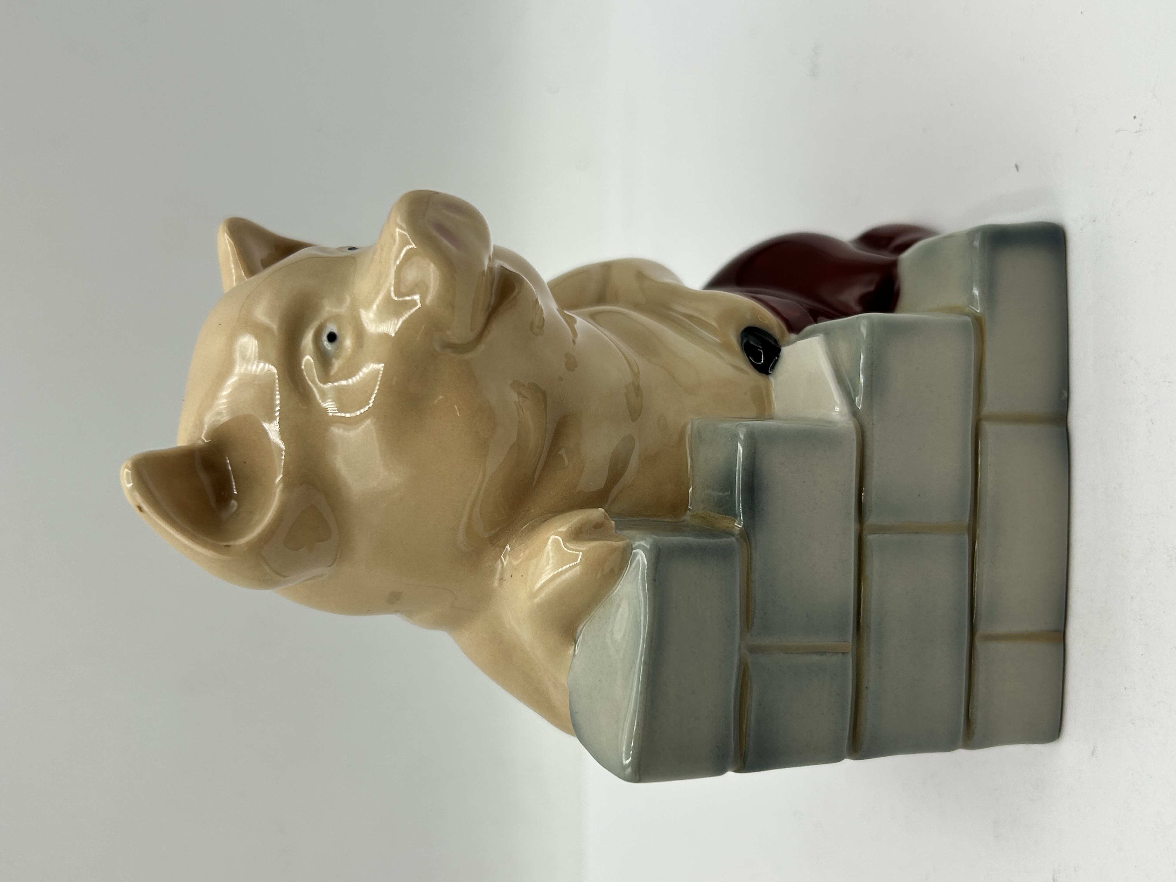 A Wade glazed ceramic figurine titled House of Brick, produced for The Official International Wade Collectors Club in 1995. The piece depicts an anthropomorphic pig in a maroon garment leaning over a stack of grey bricks, rendered in a whimsical style with a high-gloss finish. The underside displays the red Wade logo alongside text reading THE OFFICIAL INTERNATIONAL WADE COLLECTORS CLUB, HOUSE OF BRICK, and the year 1995.