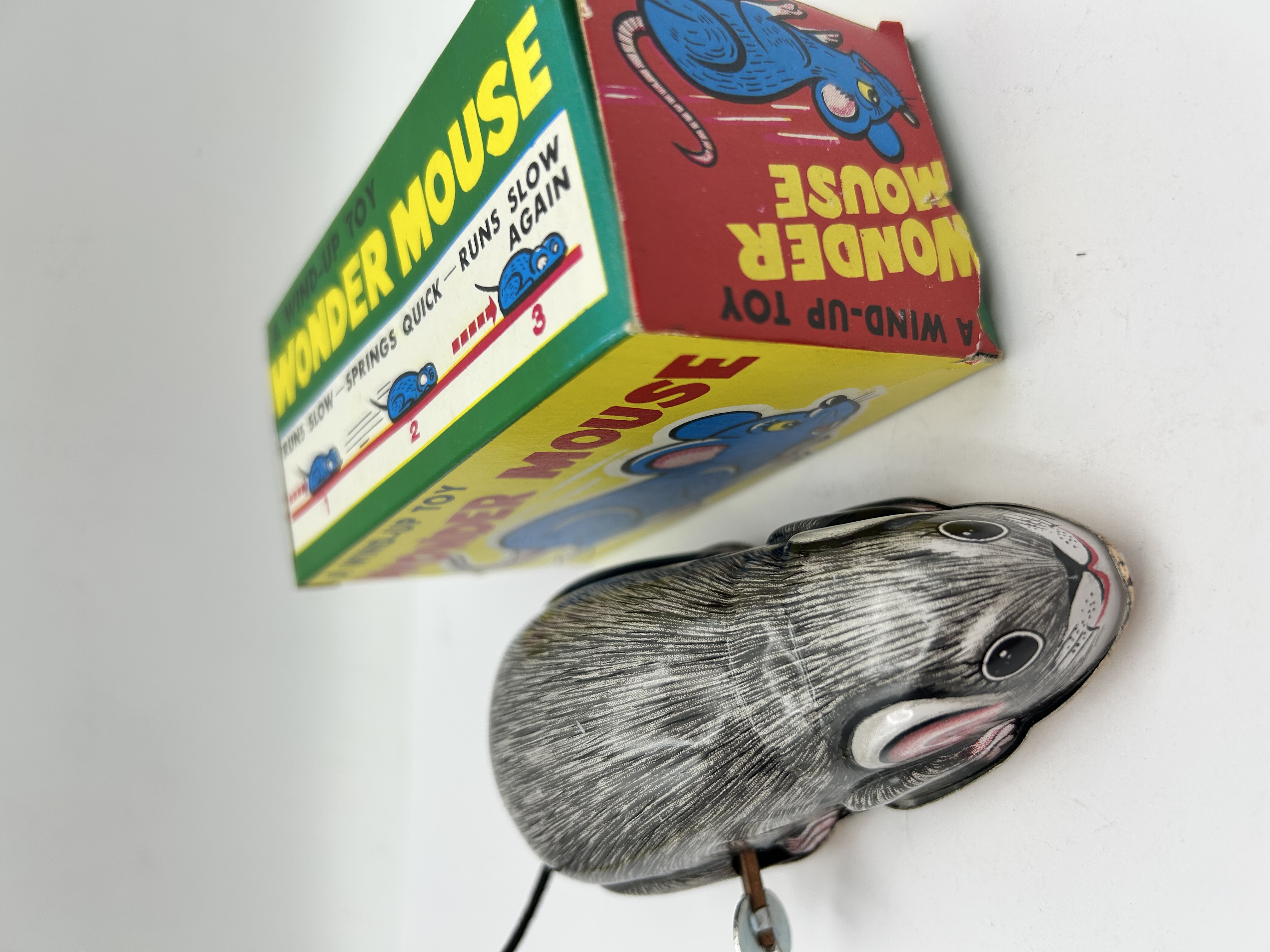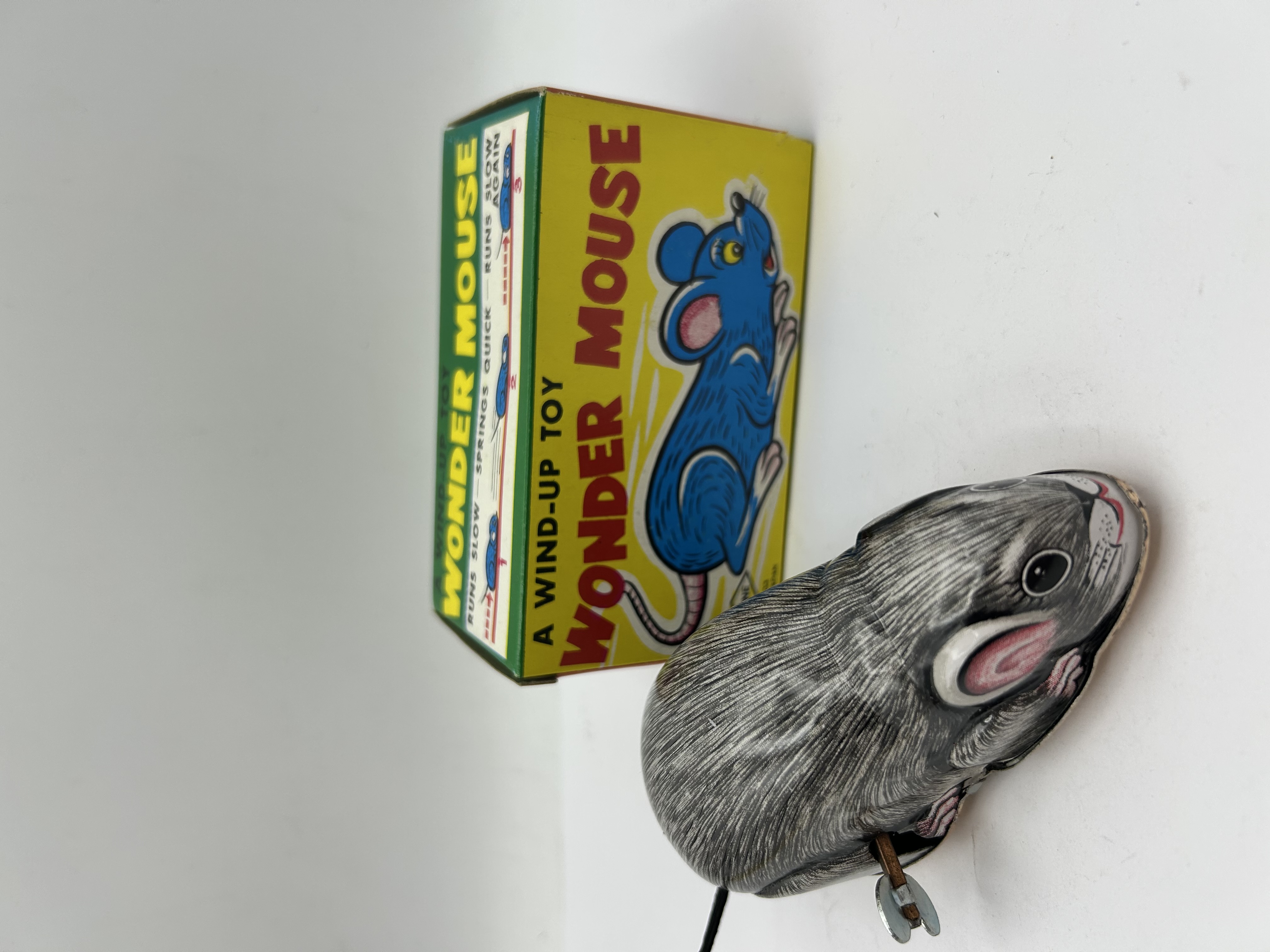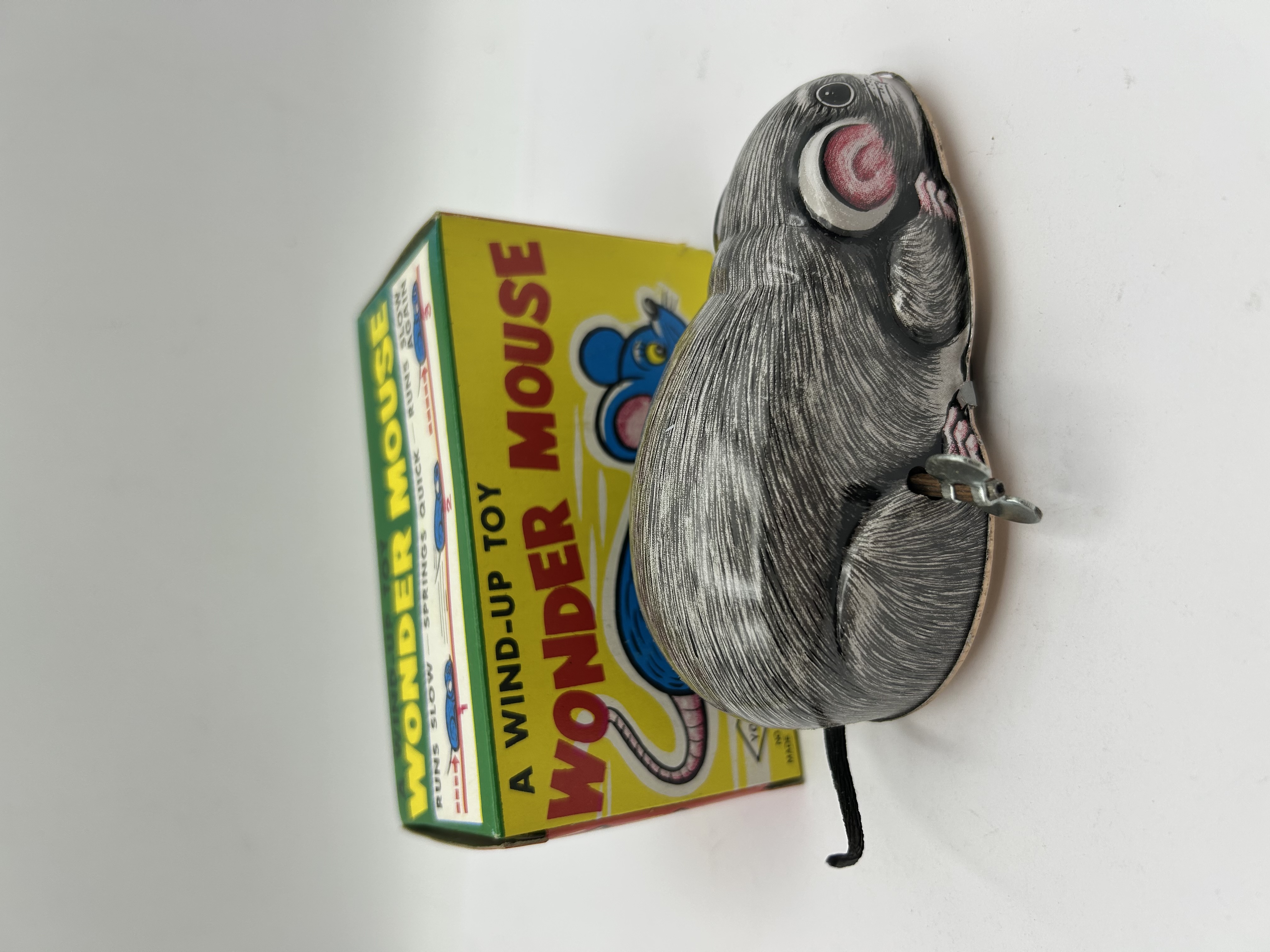 A vintage clockwork novelty toy in the form of a mouse, constructed from lithographed tinplate. The toy features a grey fur-patterned body with pink accents to the inner ears and a black cord tail. It is fitted with a fixed metal winding key to the side. The item is accompanied by its original illustrated cardboard box, which is printed with the title A WIND-UP TOY WONDER MOUSE and depicts a stylised blue mouse. The side panels of the box include mechanical operating instructions. The box is marked MADE IN JAPAN and bears the manufacturer logo for Yone.