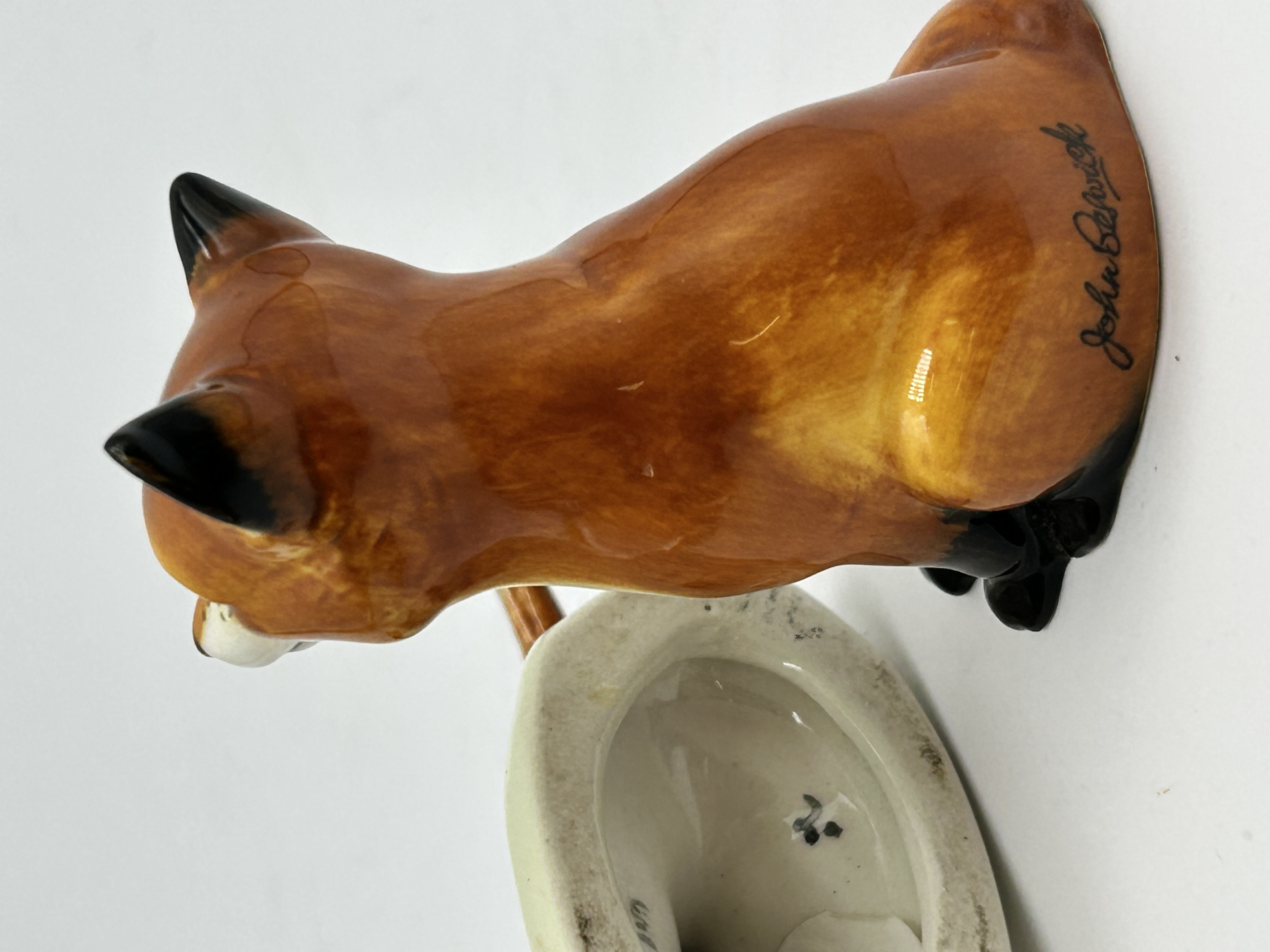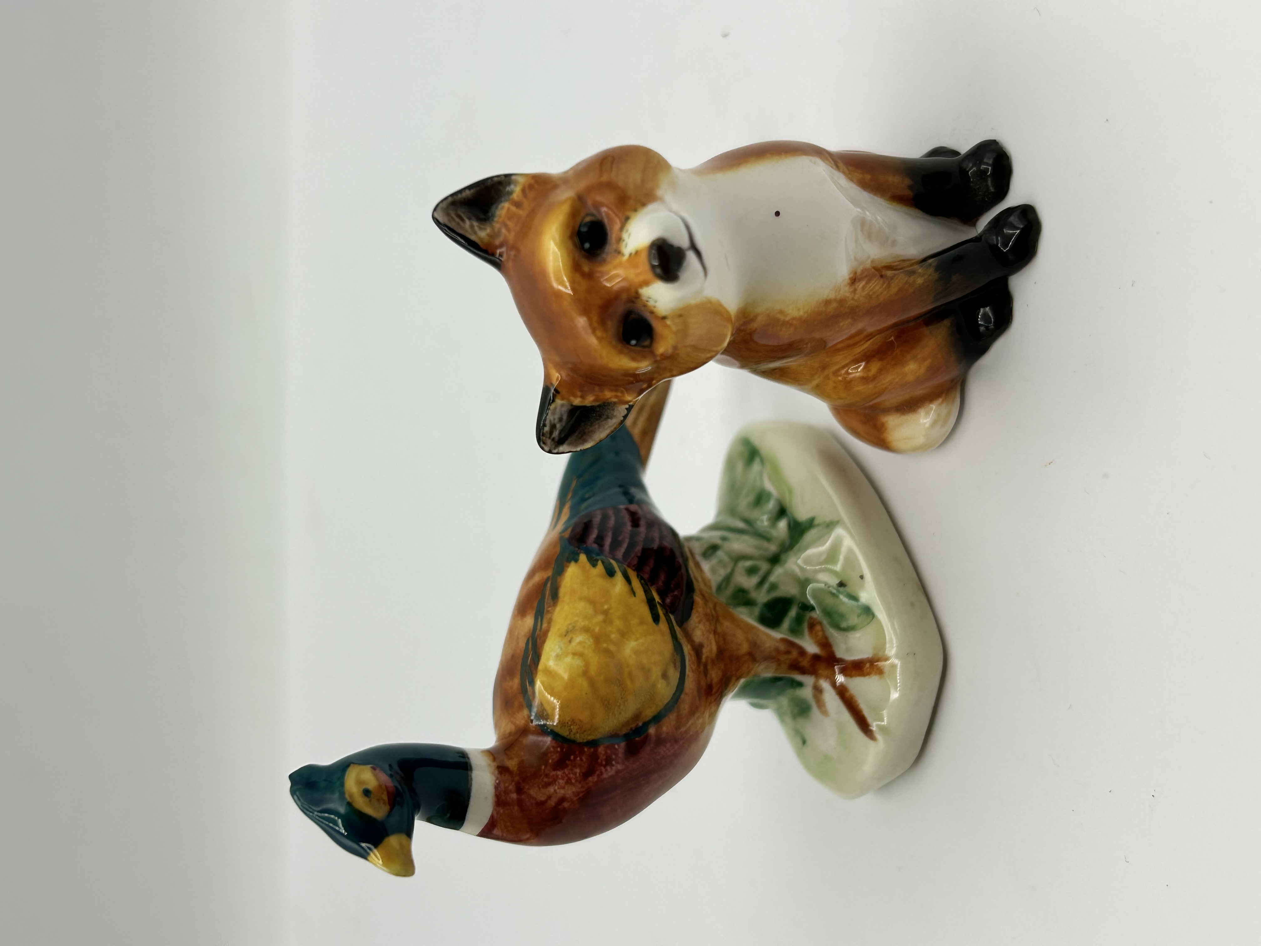 A group of two glazed ceramic animal figurines comprising a seated fox and a standing pheasant. The fox is modelled in a seated position with naturalistic ginger and white colouring, featuring black ears and paws under a high-gloss glaze. The figurine is signed John Beswick in black script on the lower rear body. The accompanying pheasant is decorated in vibrant multi-coloured plumage and stands upon a pale green textured base. Both items exhibit a high-gloss finish and naturalistic detail.