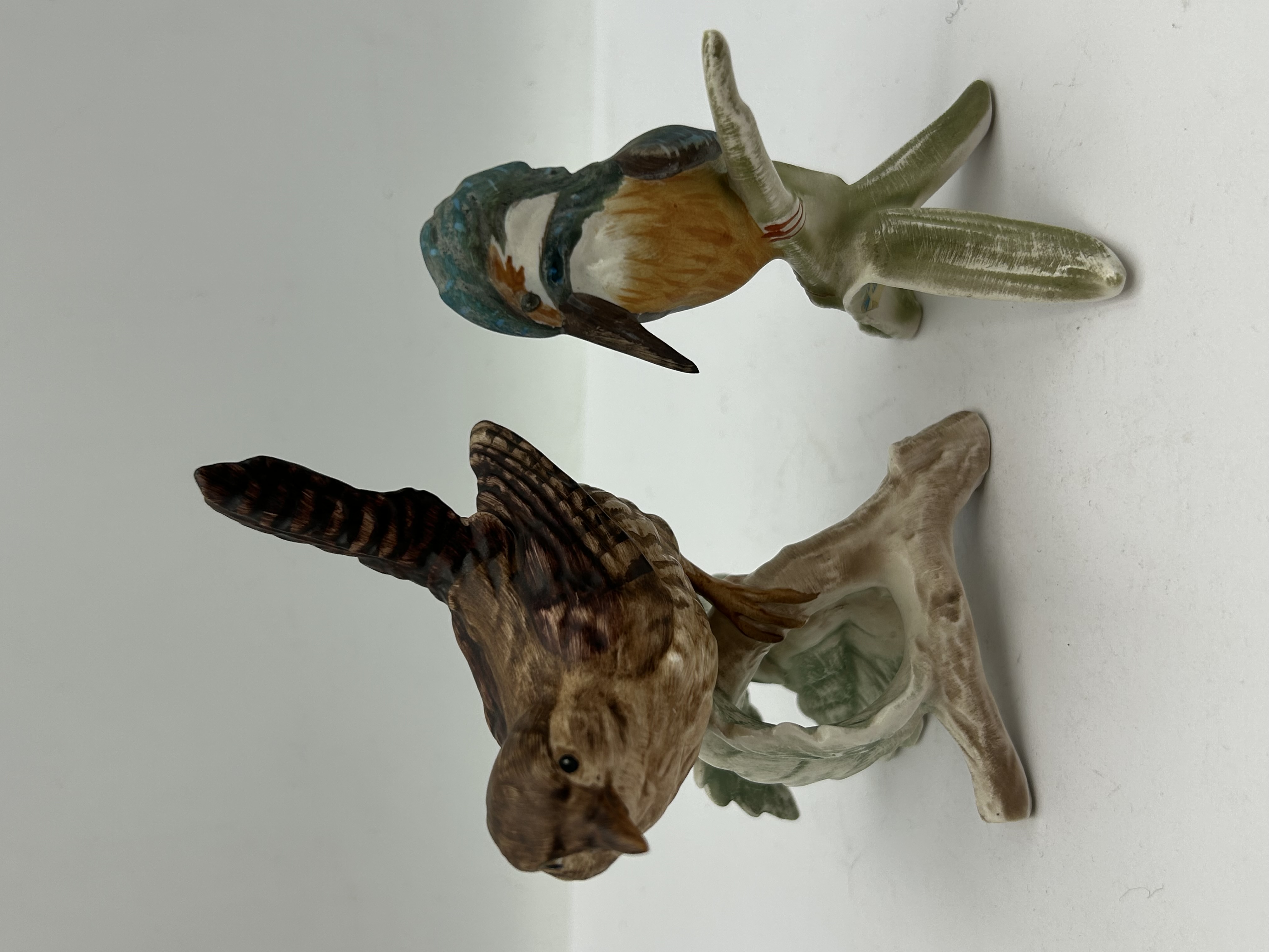 Two hand-painted porcelain bird figurines produced by Goebel, West Germany. The group comprises a kingfisher and a wren, each naturalistically modelled and perched on a stylised branch base. The kingfisher is finished with blue and orange plumage, while the wren is rendered in mottled brown tones. The undersides of the bases are marked with blue underglaze Goebel W. Germany stamps and include original paper labels identifying the subjects in German, English, and French as Eisvogel/Kingfisher/Martin-pecheur and Zaunkonig/Wren/Roitelet. The pieces also display impressed model numbers, including 58.