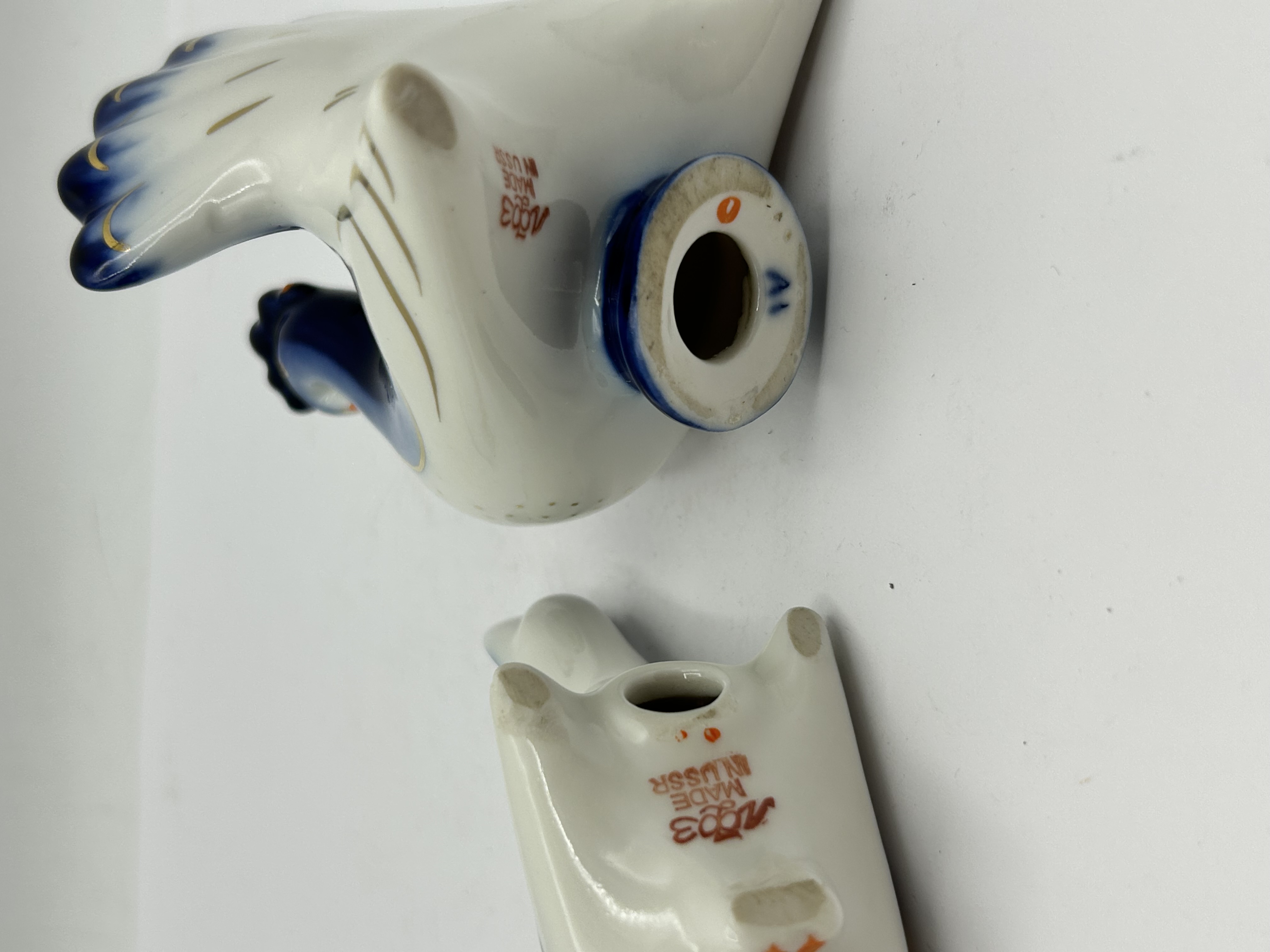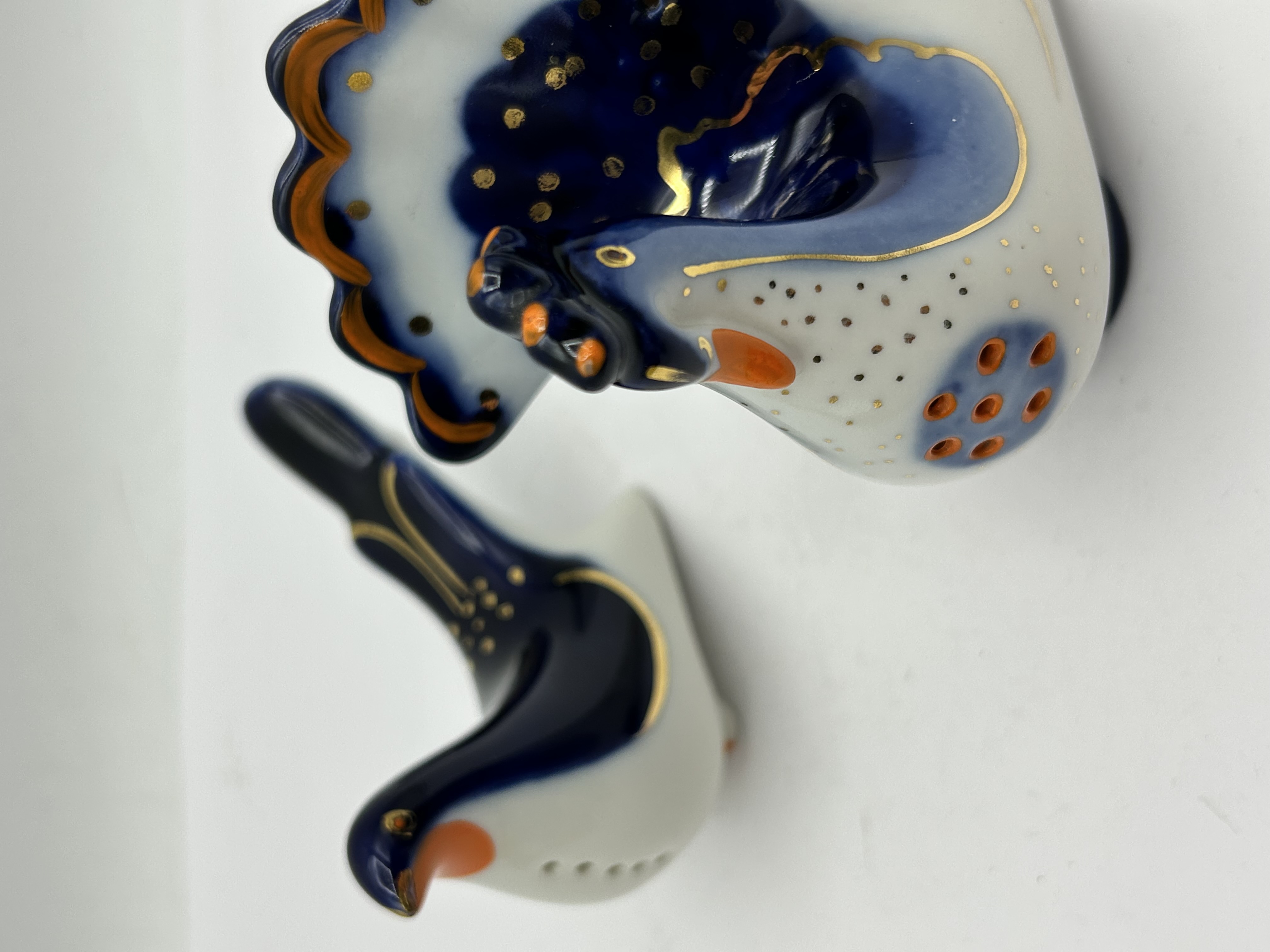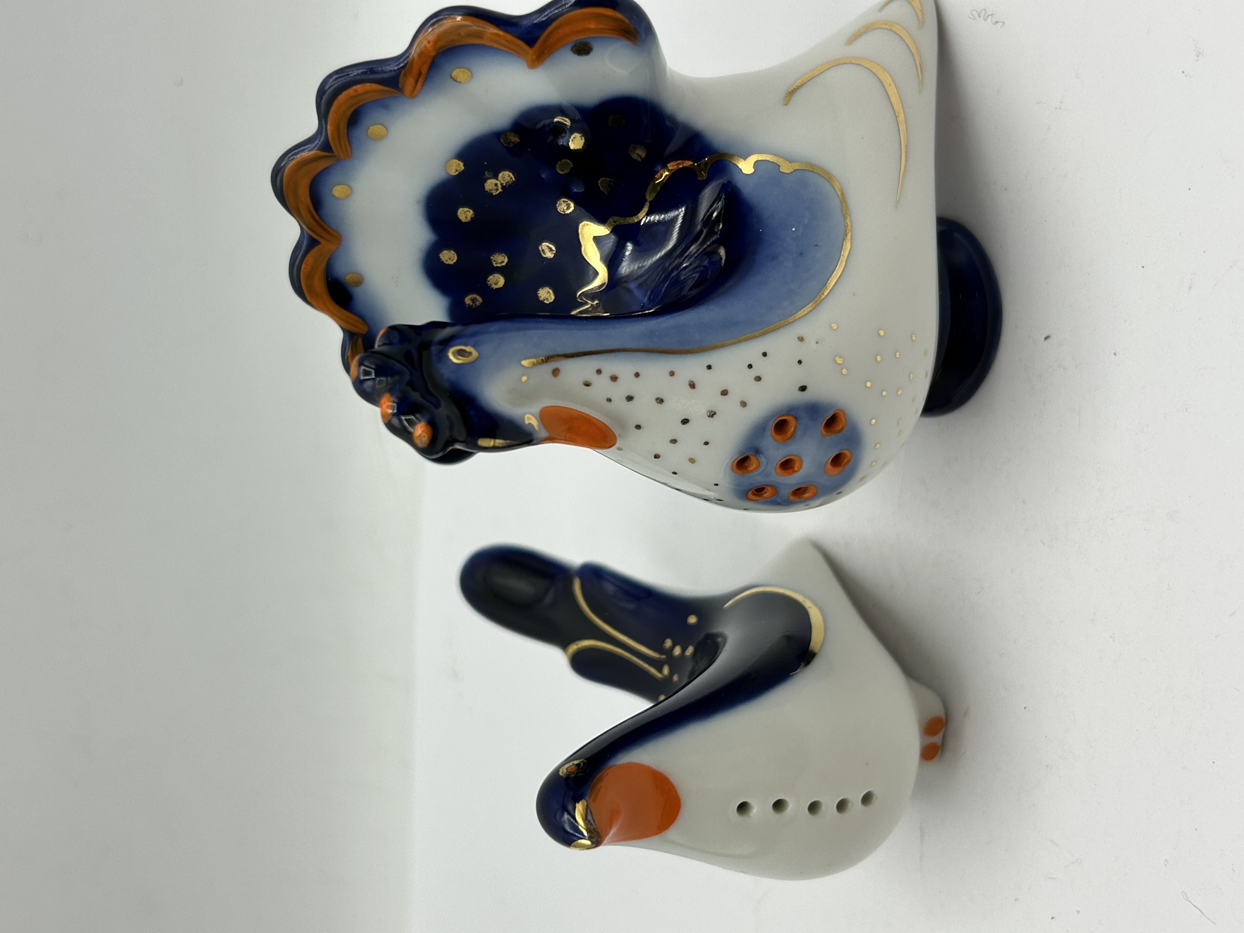 A pair of porcelain salt and pepper shakers produced by the Lomonosov Porcelain Factory (LFZ). The set consists of two stylised bird figurines, representing a rooster and a hen. Each item is decorated with a white glaze and hand-painted with cobalt blue, orange, and gilded accents in a style reminiscent of Gzhel pottery. The pieces are designed with dispense holes on the body and a circular filling aperture on the base. Both figurines are marked on the underside with the red LFZ factory monogram and the text MADE IN USSR, indicating production in the late 20th century.